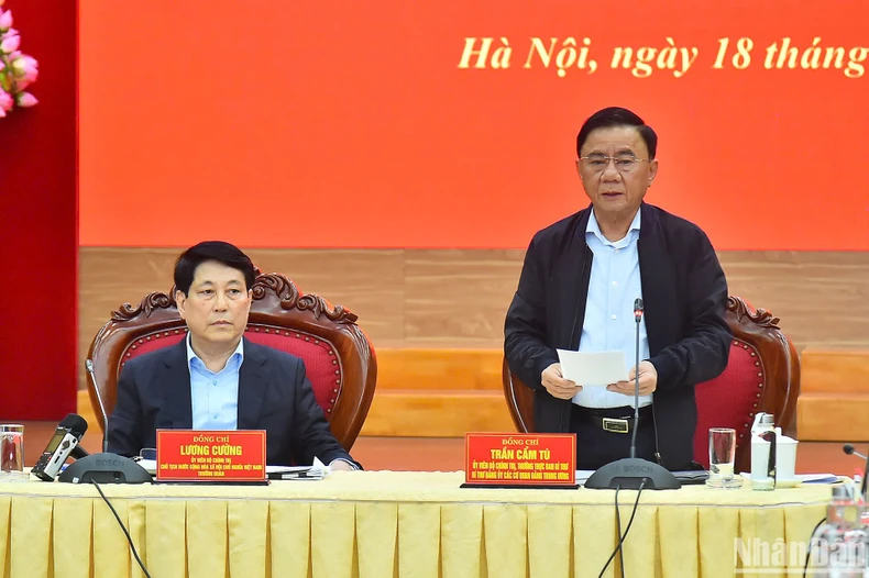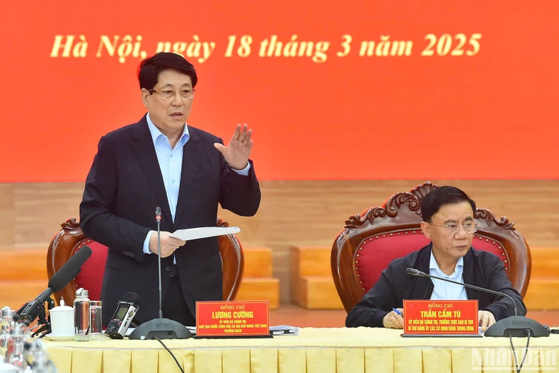 Chủ trì Hội nghị thông qua dự thảo báo cáo của Đoàn kiểm tra đối với Đảng ủy các cơ quan đảng Trung ương, chiều 18/3, tại Hà Nội, Chủ tịch nước Lương Cường, Trưởng Đoàn kiểm tra số 1907 của Bộ Chính trị, Ban Bí thư năm 2025 đề nghị Đảng ủy cần nắm chắc chức năng, nhiệm vụ từng cơ quan trong đảng bộ, đánh giá đúng tình hình, chủ động phối hợp chặt chẽ với các cơ quan địa phương liên quan để tham mưu đúng, trúng cho Ban Chấp hành Trung ương, Bộ Chính trị, Ban Bí thư, đồng chí Tổng Bí thư trong lãnh đạo, chỉ đạo tổ chức thực hiện các mục tiêu, nhiệm vụ, chỉ thị, nghị quyết của Đảng.