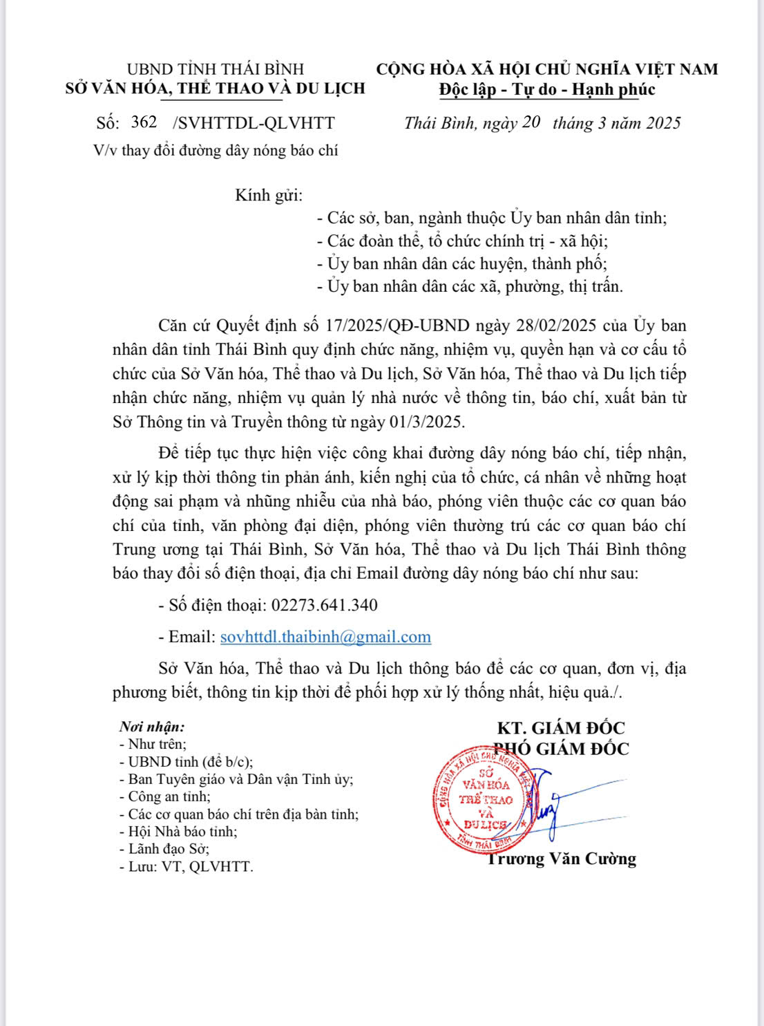 Công văn số 362/SVHTTDL-QLVHTT của UBND tỉnh về việc thay đổi đường dây nóng báo chí