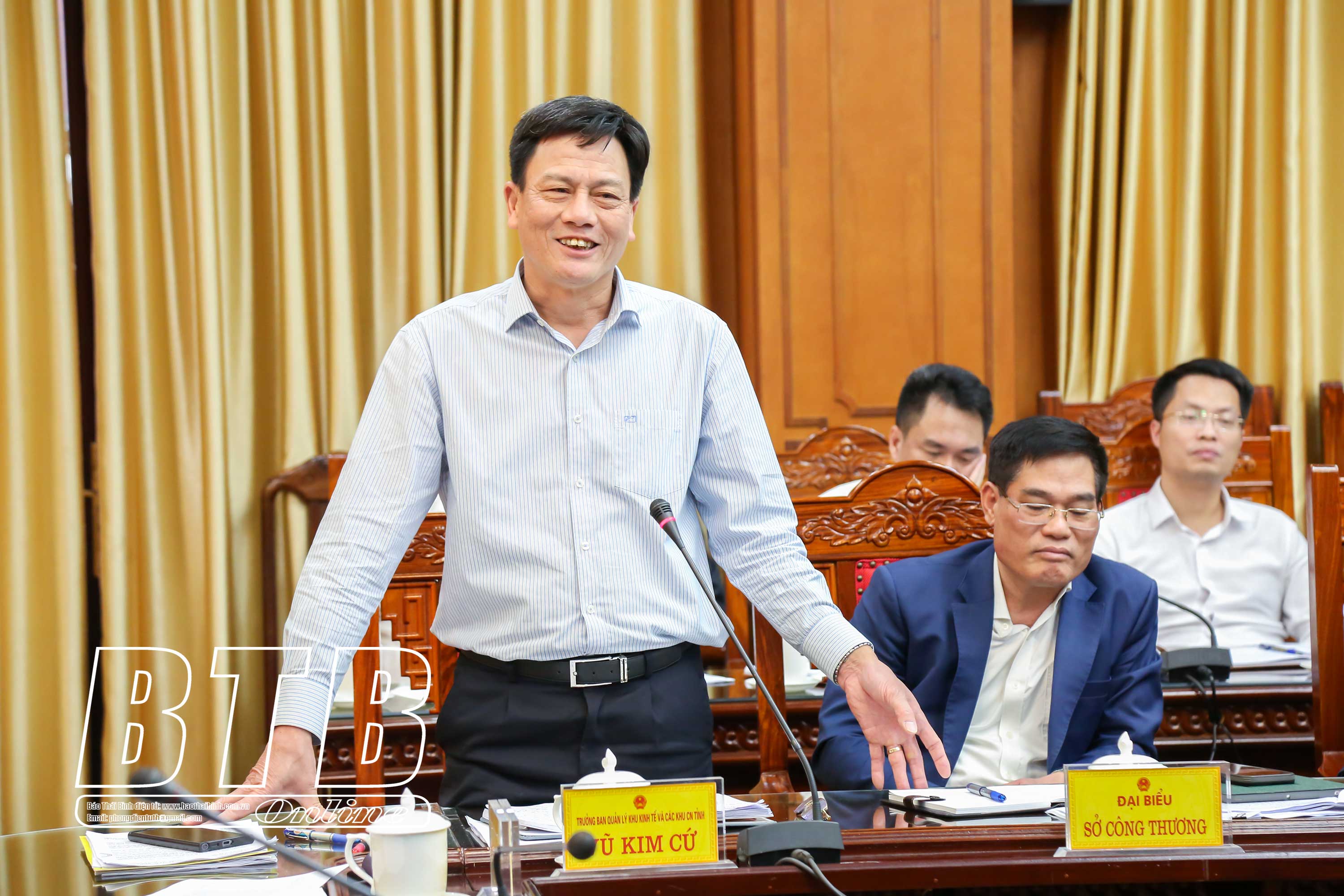 Đồng chí Vũ Kim Cứ, Ủy viên Ban Thường vụ Tỉnh ủy, Trưởng ban Quản lý Khu kinh tế và các khu công nghiệp tỉnh phát biểu tại hội nghị. Đại diện các đơn vị, địa phương, doanh nghiệp phát biểu tại hội nghị.Lãnh đạo Hiệp hội Doanh nghiệp tỉnh phát biểu tại hội nghị.