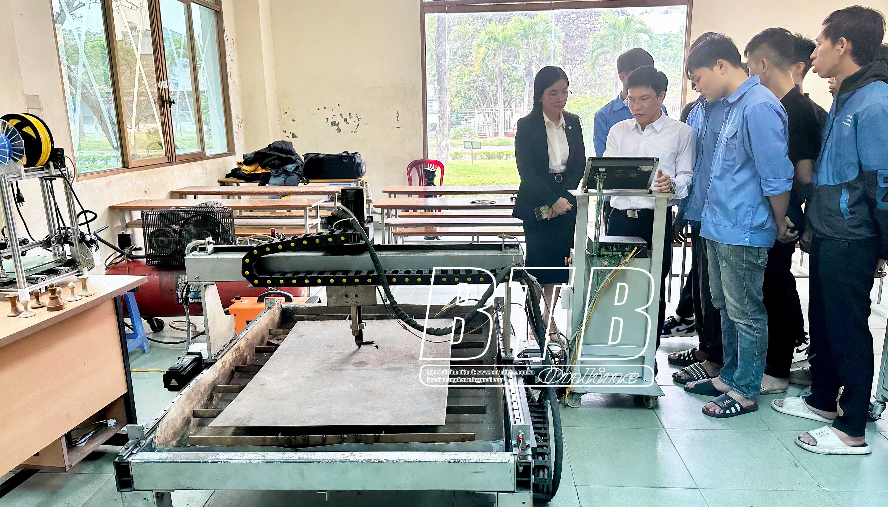 Tiến sĩ Trần Công Thức cùng nhóm sinh viên Trường Đại học Thái Bình nghiên cứu, chế tạo máy móc phục vụ dạy và học.