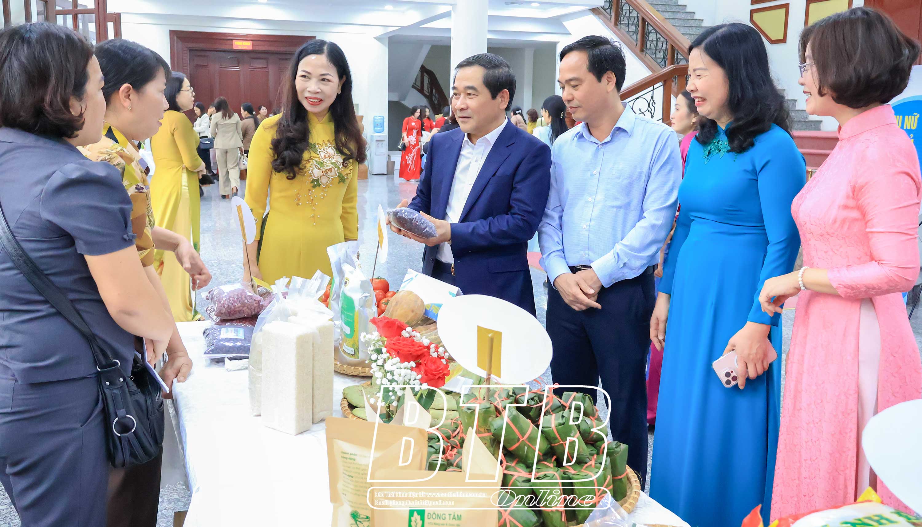 Các đồng chí: Nguyễn Tiến Thành, Phó Bí thư thường trực Tỉnh ủy, Chủ tịch HĐND tỉnh; Vũ Ngọc Trì, Tỉnh ủy viên, Phó Chủ tịch HĐND tỉnh thăm gian trưng bày nông sản của hội LHPN các huyện, thành phố.