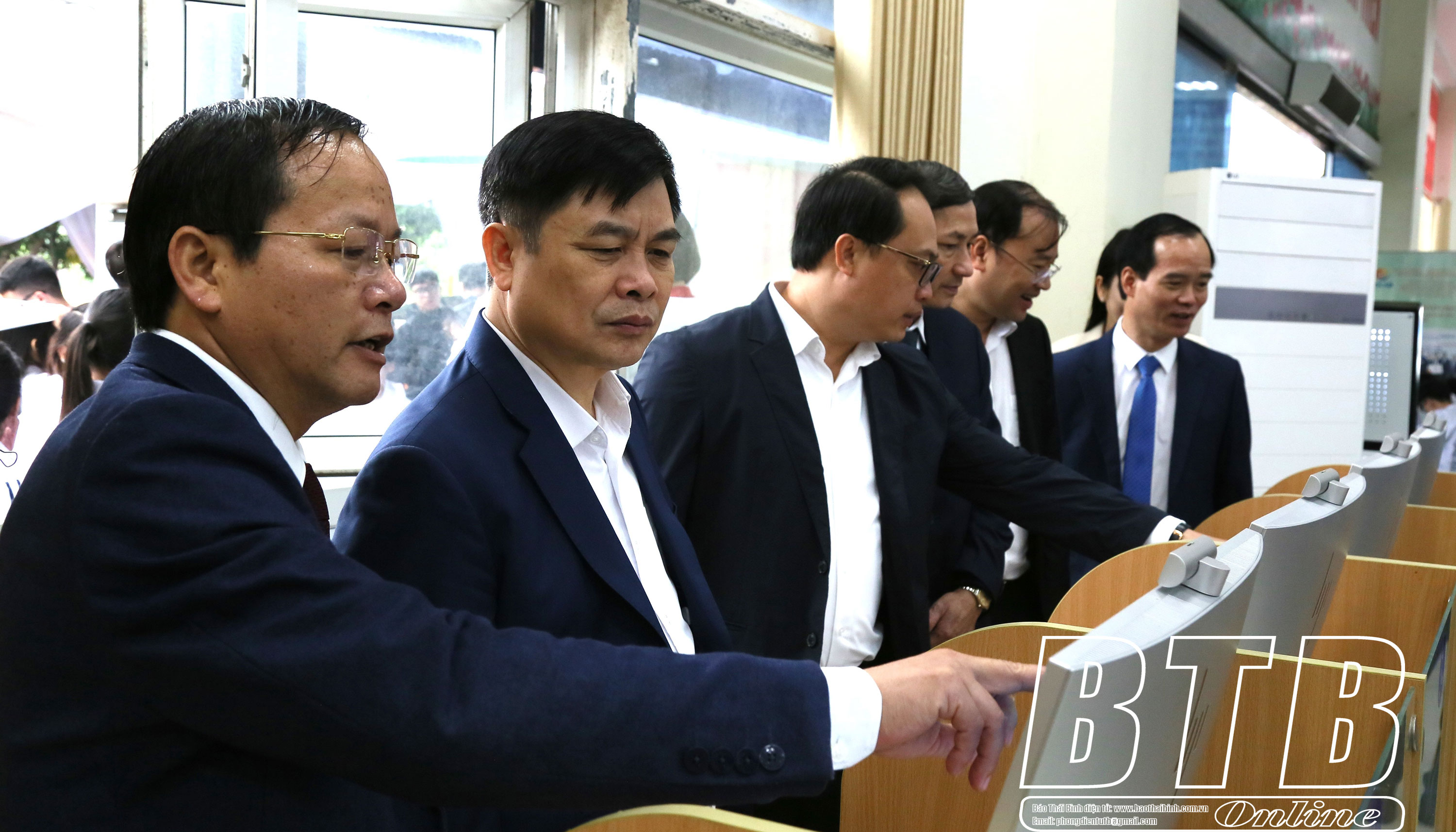 Các đồng chí lãnh đạo tỉnh và đại biểu tìm hiểu thông tin trên sàn giao dịch việc làm Thái Bình, tại Trung tâm Dịch vụ việc làm Thái Bình.