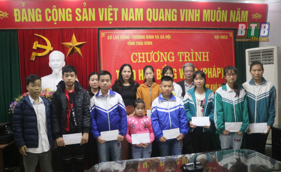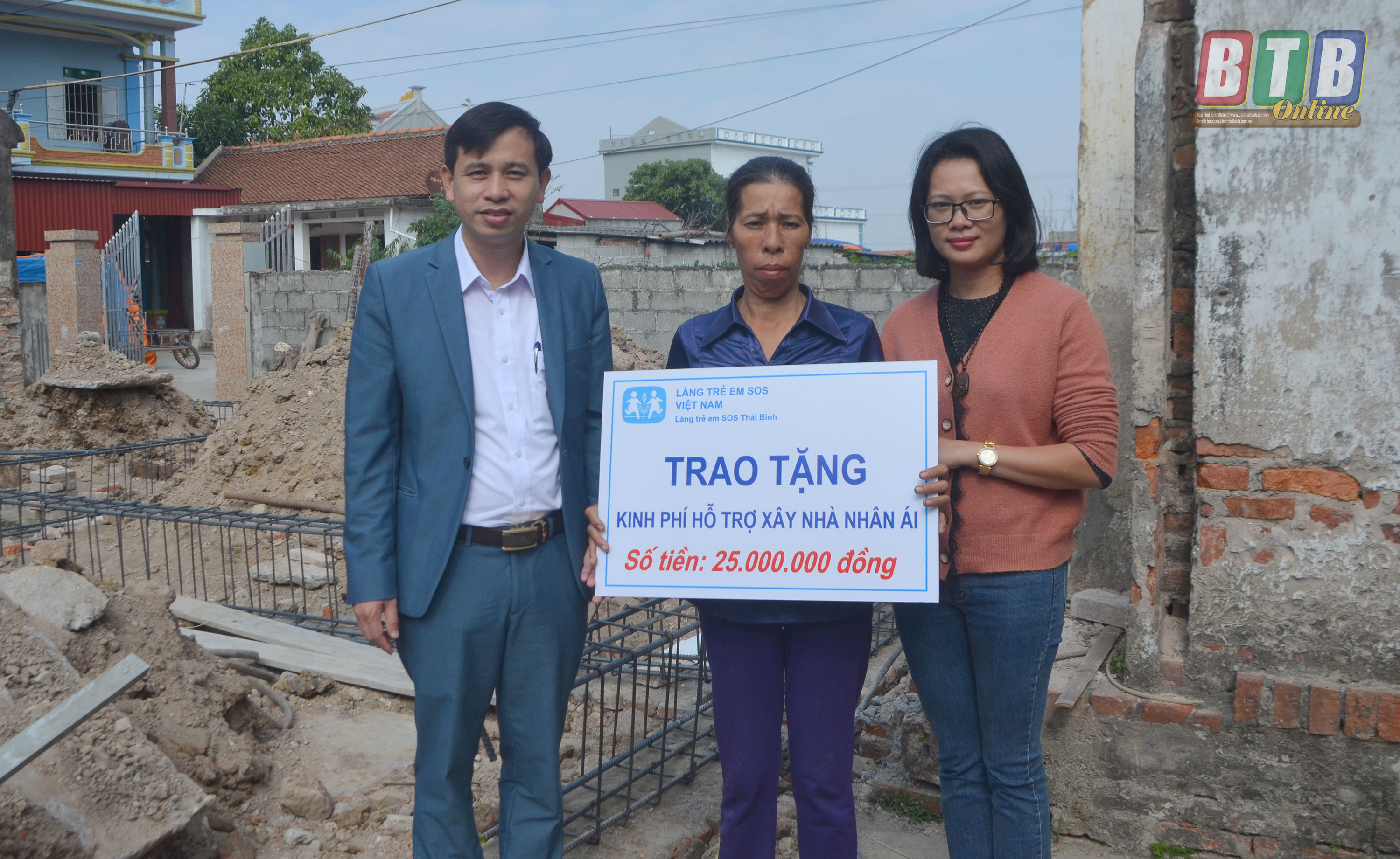 Lãnh đạo Làng trẻ em SOS Thái Bình trao kinh phí hỗ trợ xây nhà nhân ái cho gia đình trẻ em có hoàn cảnh khó khăn xã Thụy Dũng (Thái Thụy).