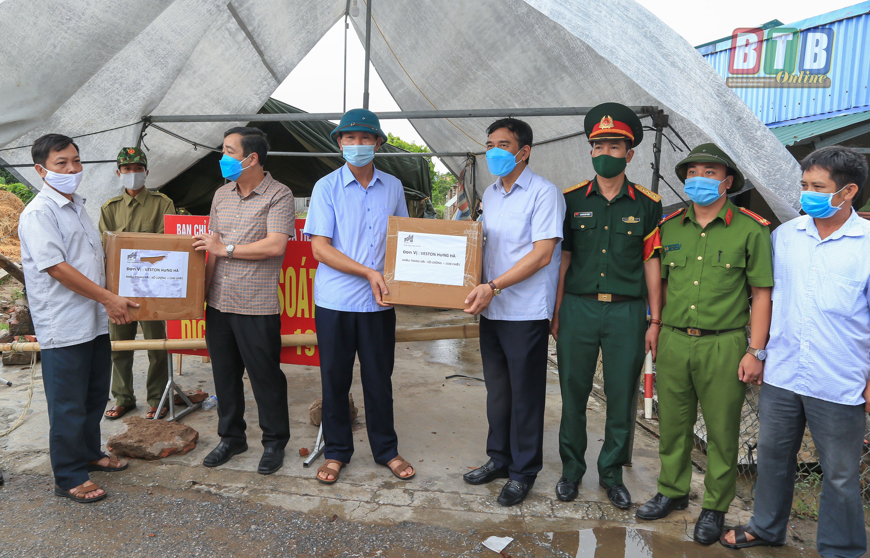 Các đồng chí: Ngô Đông Hải, Ủy viên dự khuyết Trung ương Đảng, Bí thư Tỉnh ủy; Đặng Trọng Thăng, Phó Bí thư Tỉnh ủy, Chủ tịch UBND tỉnh trao tặng khẩu trang phòng, chống dịch cho xã Hòa Tiến (Hưng Hà). Ảnh: Thành Tâm