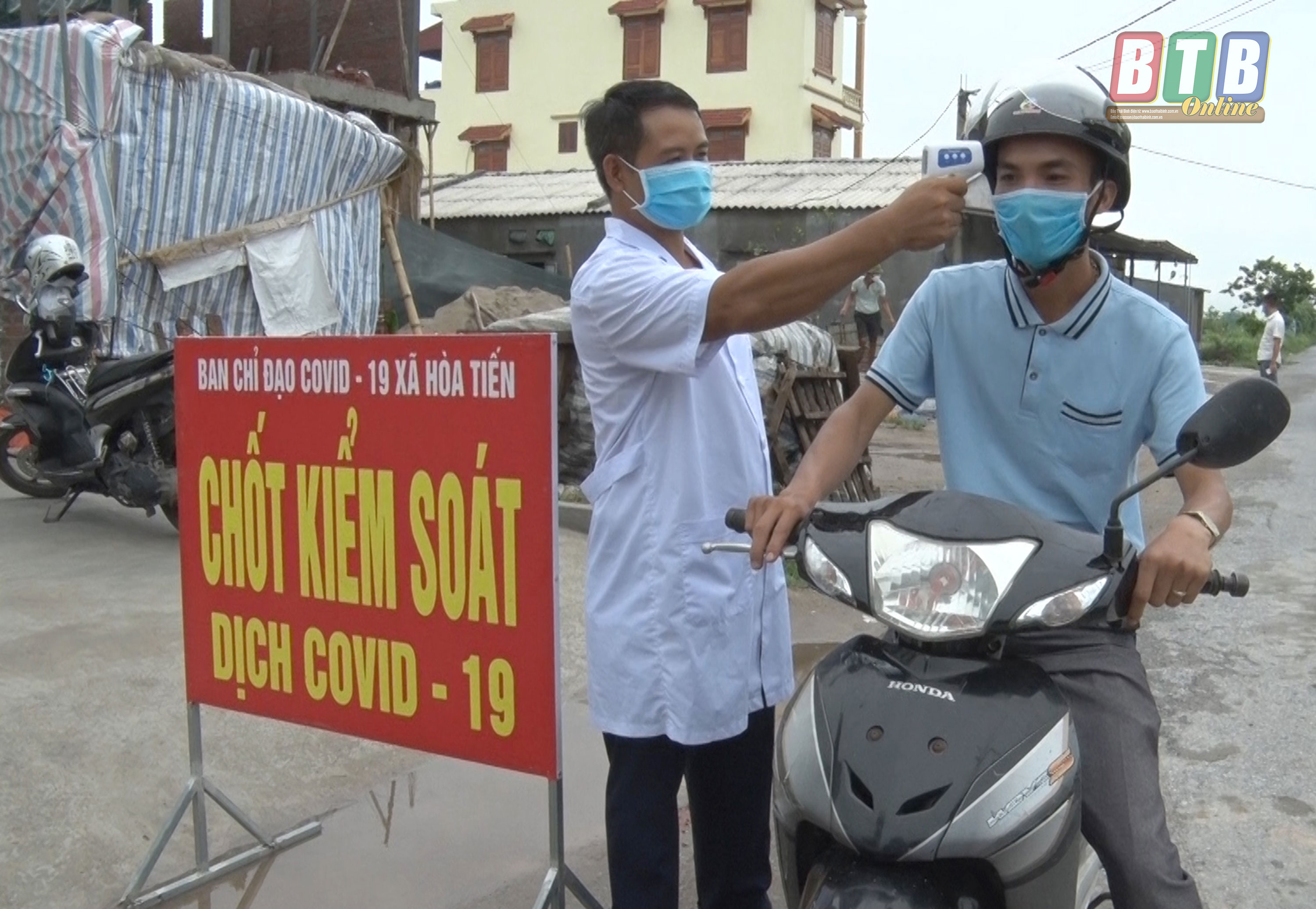 Kiểm tra thân nhiệt tại chốt kiểm soát dịch Covid-19 xã Hòa Tiến (Hưng Hà).