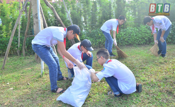 Các em học sinh tham gia dọn vệ sinh môi trường trong khuôn viên Đền thờ Liệt sĩ tỉnh.