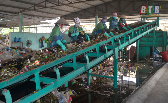 Công nhân phân loại rác thải tại Nhà máy xử lý rác thải sinh hoạt Quỳnh Côi (Quỳnh Phụ).