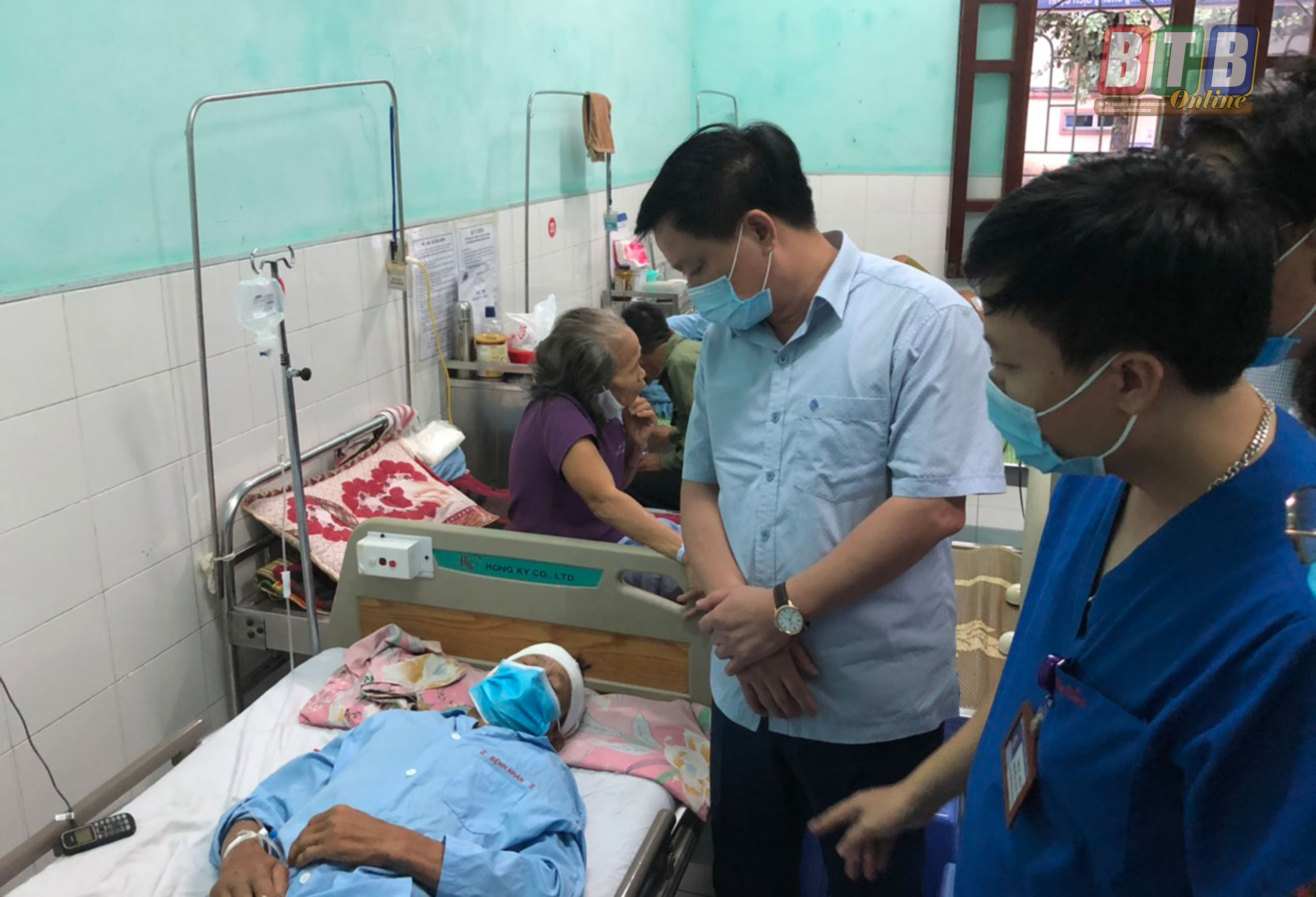 Đồng chí Nguyễn Khắc Thận, Tỉnh ủy viên, Phó Chủ tịch thường trực UBND tỉnh thăm hỏi, động viên ông Nguyễn Văn Tiến, nạn nhân của vụ tai nạn hiện đang được điều trị tích cực tại Bệnh viện Đa khoa tỉnh.