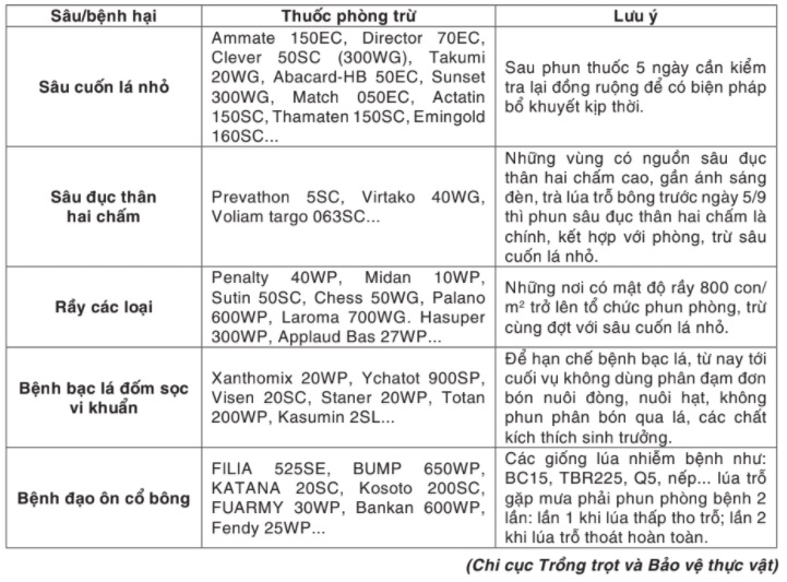 Để hạn chế thiệt hại do sâu bệnh gây ra, các địa phương cần tiếp tục thực hiện nghiêm văn bản chỉ đạo của tỉnh, của Sở Nông nghiệp và Phát triển nông thôn về việc tập trung chỉ đạo phòng, trừ sâu bệnh bảo vệ lúa mùa. Trạm trồng trọt và bảo vệ thực vật các huyện, thành phố tiếp tục tăng cường công tác điều tra, dự tính dự báo sâu bệnh, đặc biệt theo dõi chặt chẽ diễn biến của thời tiết và các đối tượng sâu bệnh chính như bệnh đạo ôn cổ bông, rầy nâu, rầy lưng trắng, sâu cuốn lá nhỏ và một số đối tượng sâu bệnh khác hại lúa; thông báo nhanh tình hình sâu bệnh đến các hộ nông dân để chủ động phòng, trừ kịp thời nơi có áp lực sâu bệnh cao bằng các loại thuốc đặc hiệu theo hướng dẫn của cơ quan chuyên môn.
