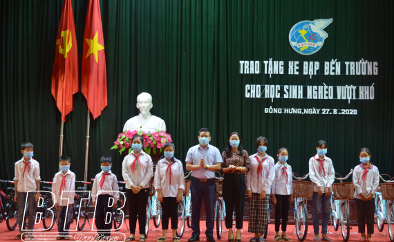 Lãnh đạo Hội LHPN tỉnh, huyện Đông Hưng trao xe đạp cho học sinh nghèo huyện Đông Hưng.