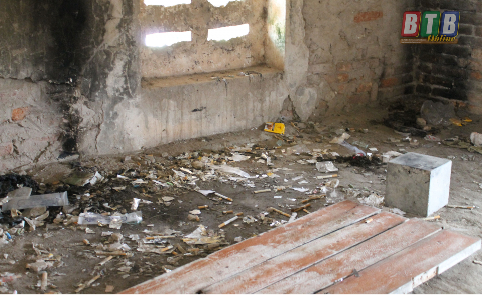 Nhiều rác thải thậm chí cả bơm kim tiêm đã qua sử dụng được tìm thấy trong điếm canh đê (xã Việt Hùng).