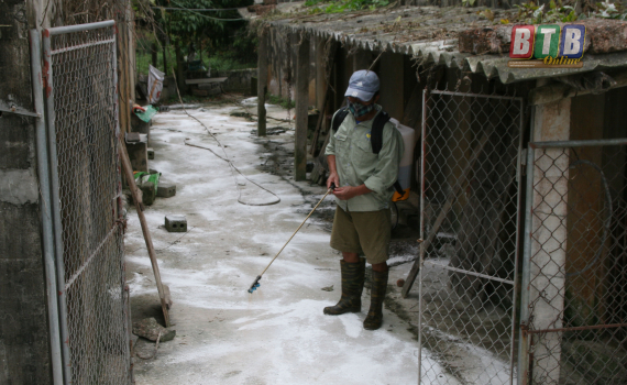 Người chăn nuôi lợn ở xã Bình Định (Kiến Xương) phun hóa chất tiêu độc khử trùng chuồng trại chăn nuôi.