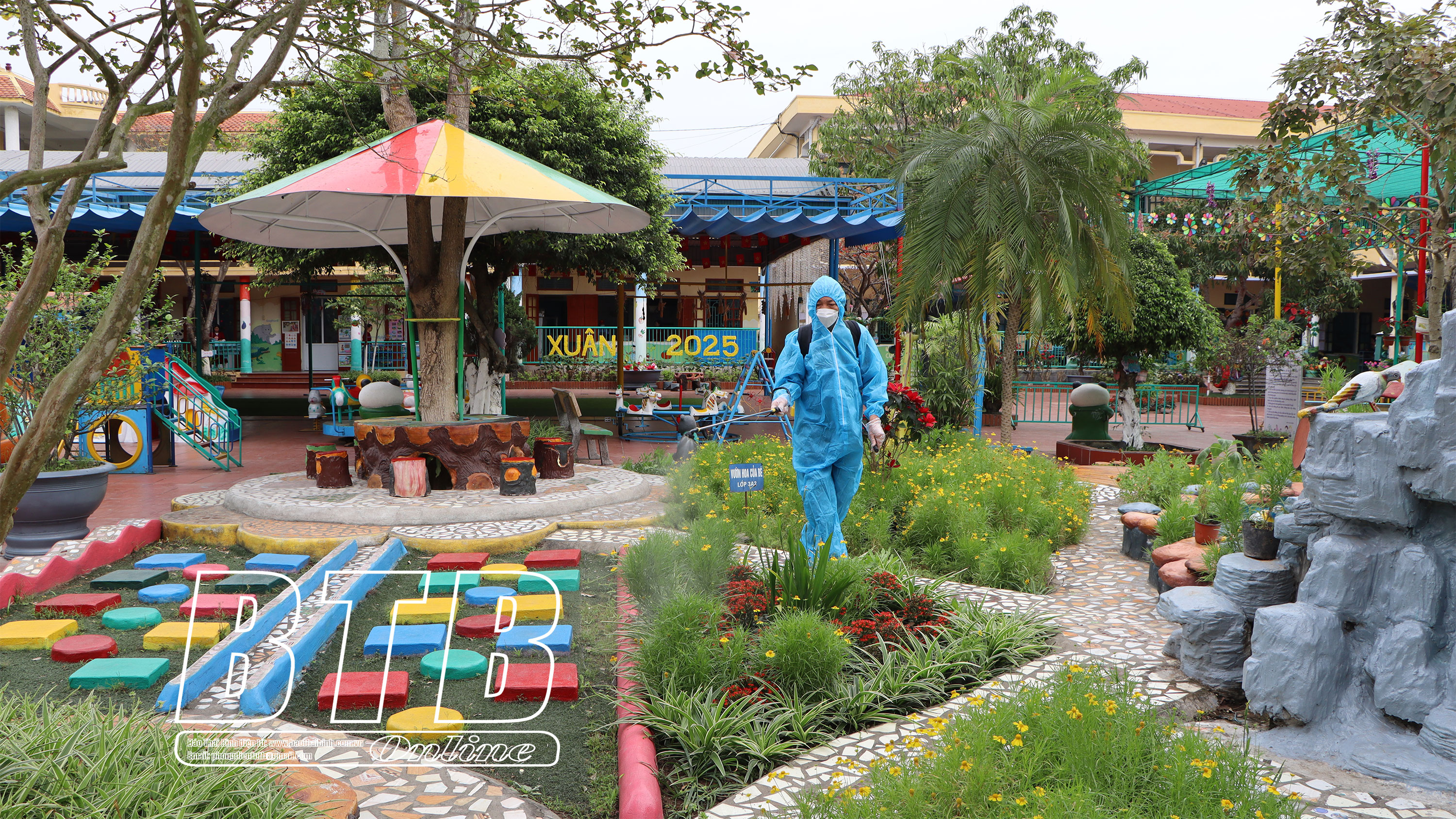 Trường Mầm non Thanh Nê thực hiện phun khử khuẩn quanh trường học.