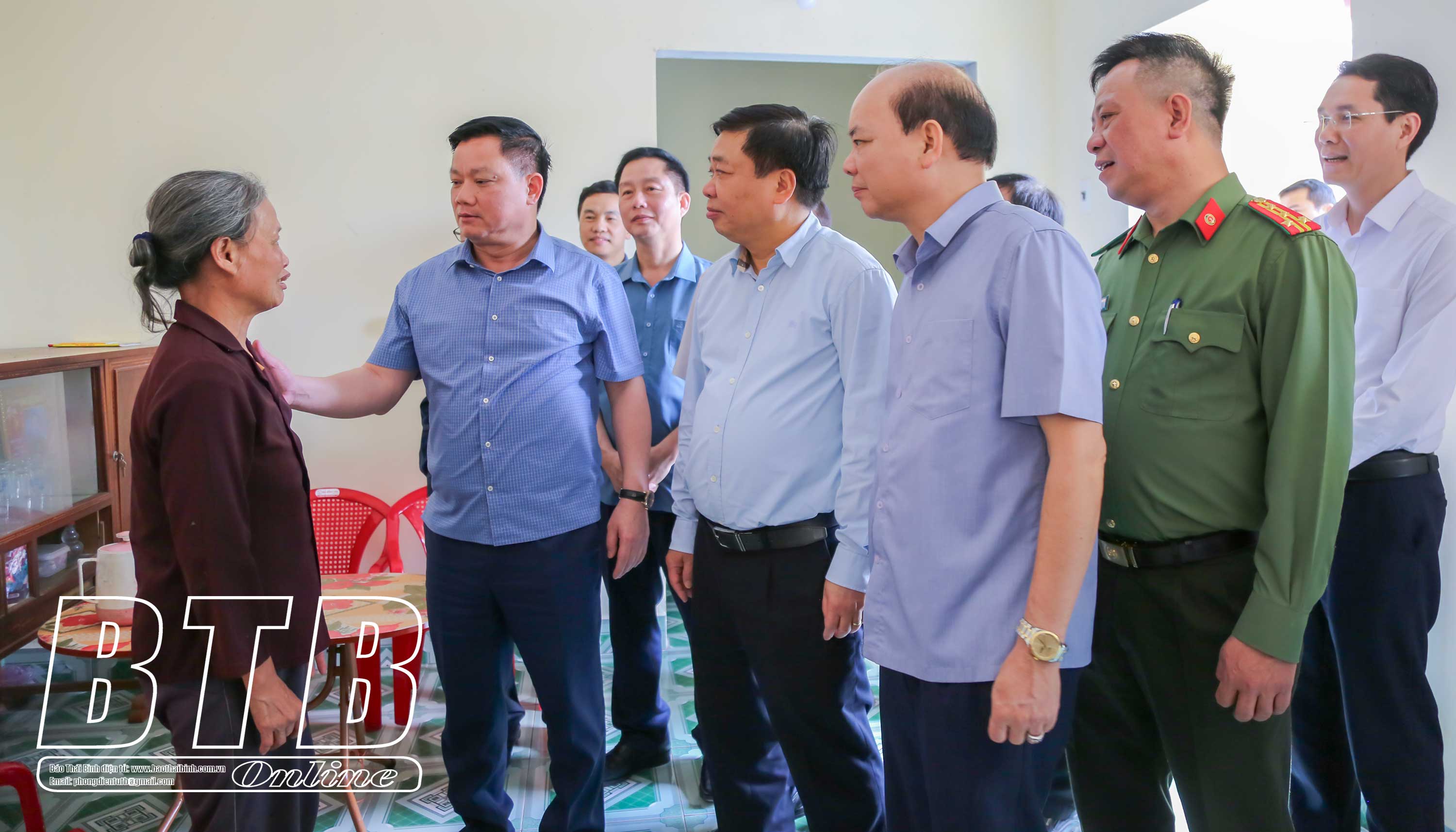 Đồng chí Nguyễn Khắc Thận, Bí thư Tỉnh ủy, Trưởng ban Chỉ đạo triển khai xóa nhà tạm, nhà dột nát trên địa bàn tỉnh thăm hỏi, động viên bà Nguyễn Thị Gắng, thôn Khả Tân, xã Duyên Hải (Hưng Hà).
