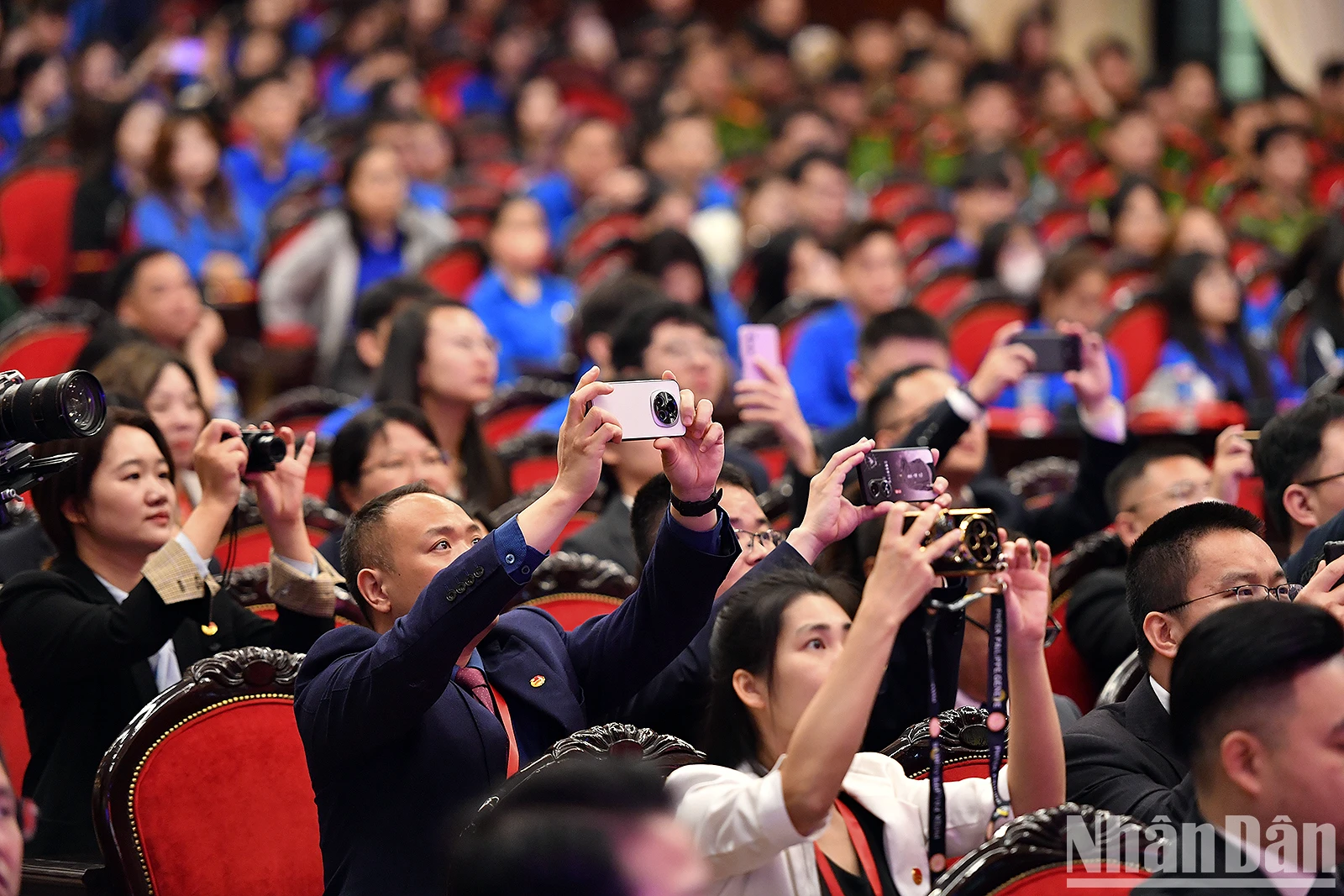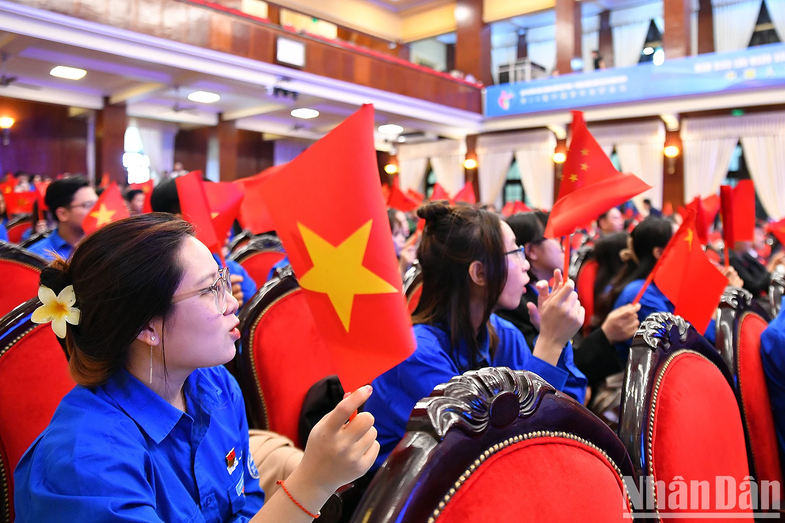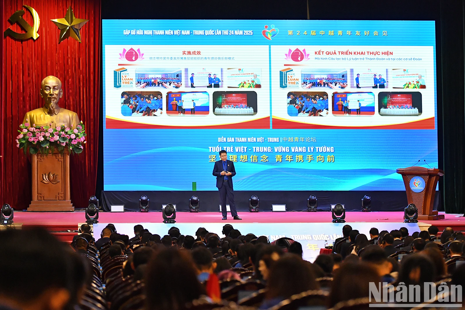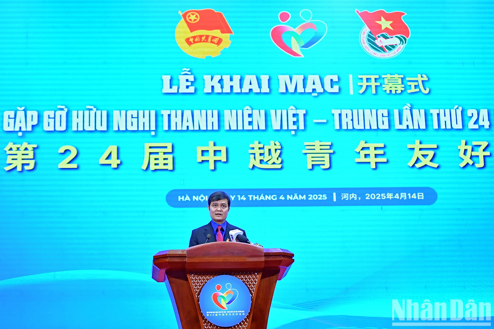 Bí thư thứ nhất Trung ương Đoàn Thanh niên Cộng sản Hồ Chí Minh Bùi Quang Huy và Bí thư thứ nhất Ban Bí thư Trung ương Đoàn Thanh niên Cộng sản Trung Quốc A Đông và các đại biểu tại buổi lễ.