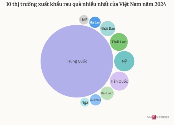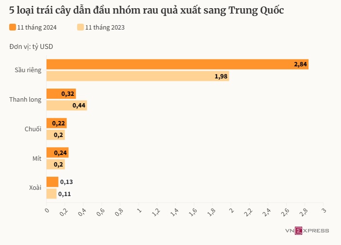 Hiện 14 loại nông sản Việt đã được xuất khẩu chính ngạch sang nước láng giềng, đem lại doanh thu hàng tỷ USD mỗi năm. Năm ngoái, người tiêu dùng Trung Quốc chi 4,6 tỷ USD để mua rau quả Việt. Trong đó, thanh long đứng đầu với hơn 1,2 tỷ USD, sầu riêng khoảng 900 triệu USD, chuối 400 triệu USD.