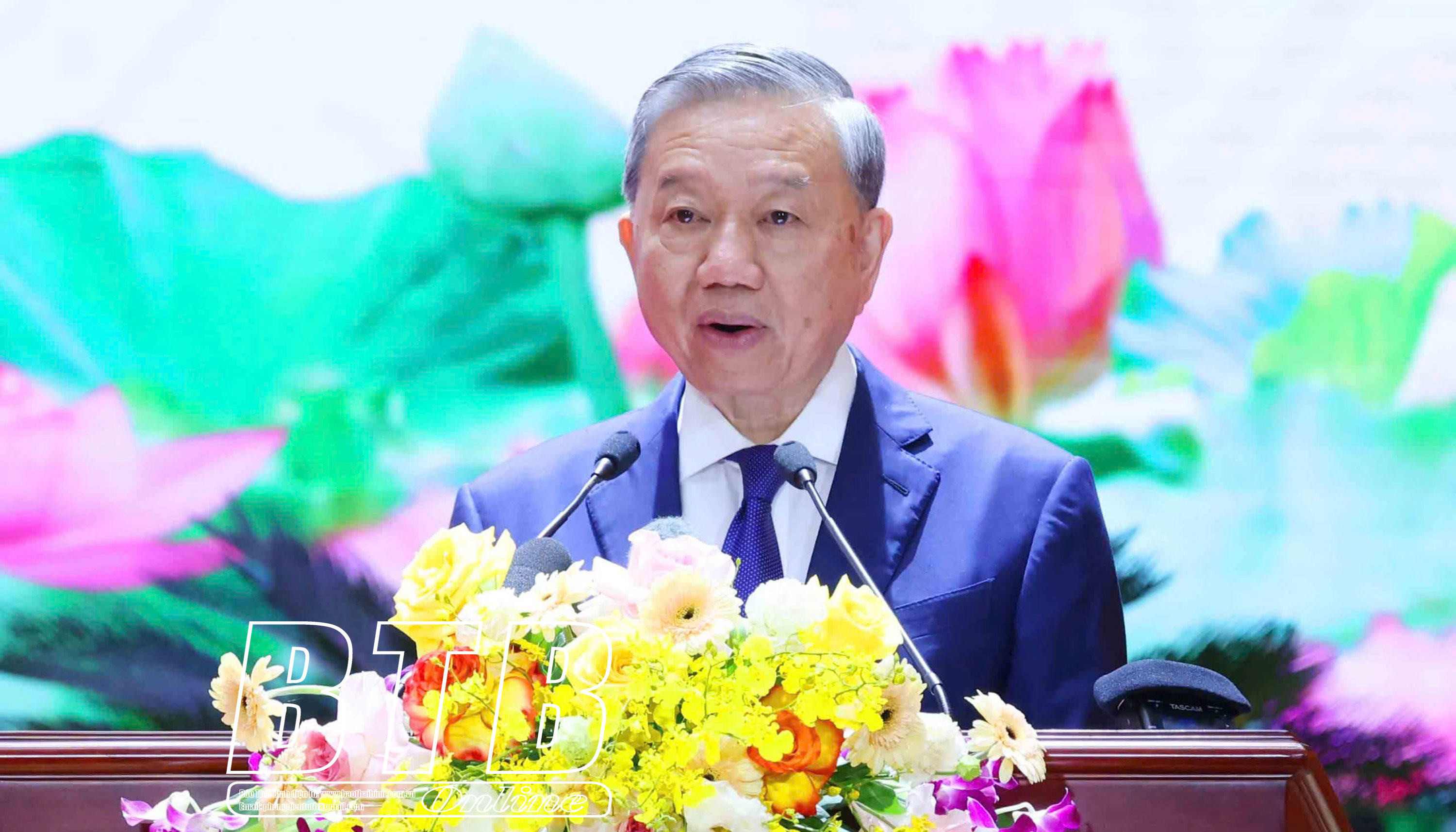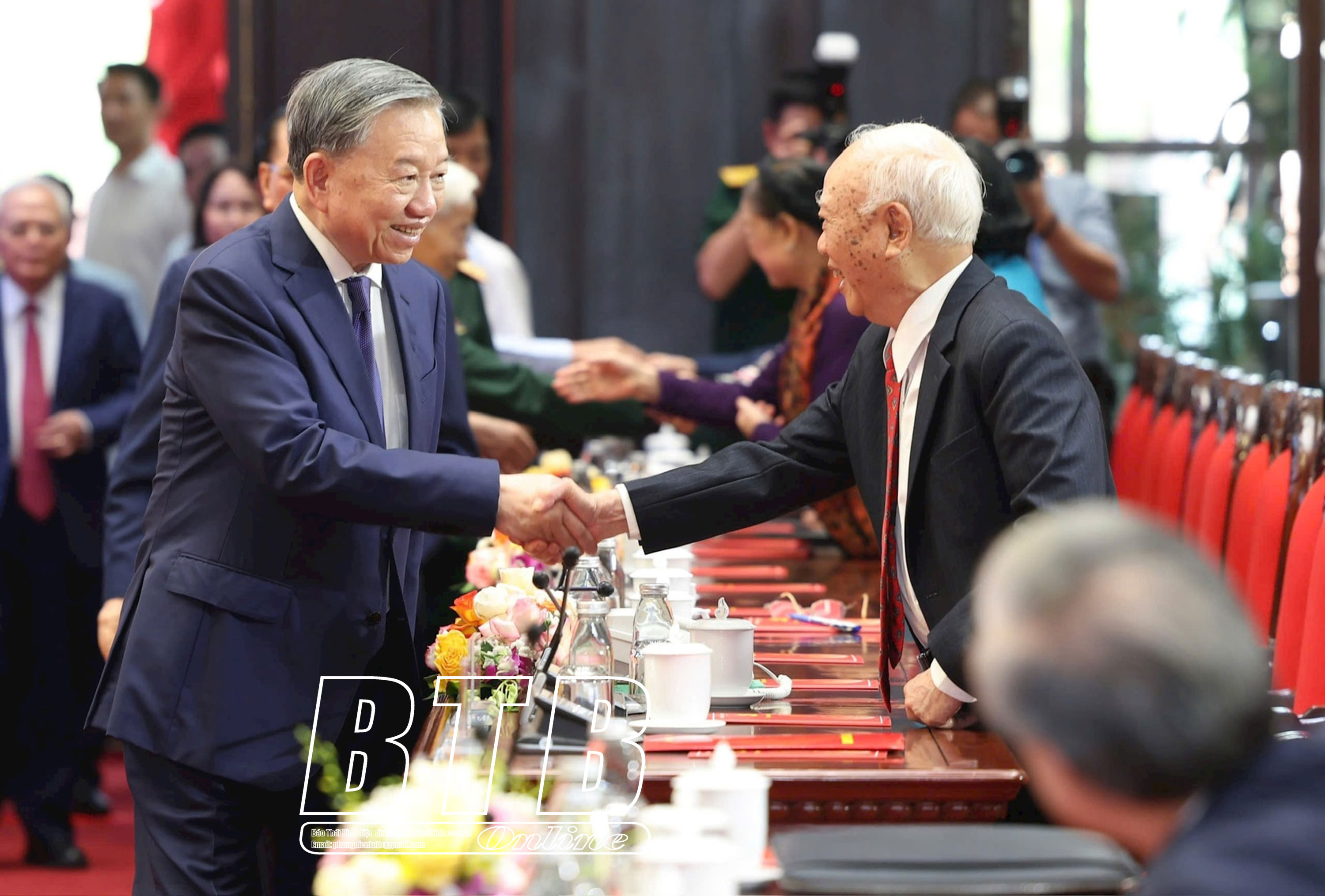 Phát biểu tại buổi gặp mặt, Tổng Bí thư Tô Lâm khái quát những thành tựu vĩ đại của dân tộc ta trải qua 95 năm dưới sự lãnh đạo của Đảng, 80 năm nhà nước Việt Nam mới ra đời và 50 năm giải phóng miền Nam, thống nhất đất nước, gần 40 năm đổi mới. Trong đó, chặng đường gần một thế kỷ dưới sự lãnh đạo của Đảng, từ một nước nghèo nàn, lạc hậu, bị chiến tranh tàn phá trong hàng chục năm liên tục, bị bao vây, cô lập... nhưng đến nay, Việt Nam đã trở thành nước xã hội chủ nghĩa đang phát triển, có thu nhập trung bình, hội nhập sâu, rộng vào nền chính trị thế giới, nền kinh tế toàn cầu, nền văn minh nhân loại, đảm nhiệm nhiều trọng trách quốc tế, phát huy vai trò tích cực tại nhiều tổ chức, diễn đàn đa phương quan trọng. Độc lập, chủ quyền, thống nhất và toàn vẹn lãnh thổ được giữ vững, lợi ích quốc gia, dân tộc được bảo đảm.