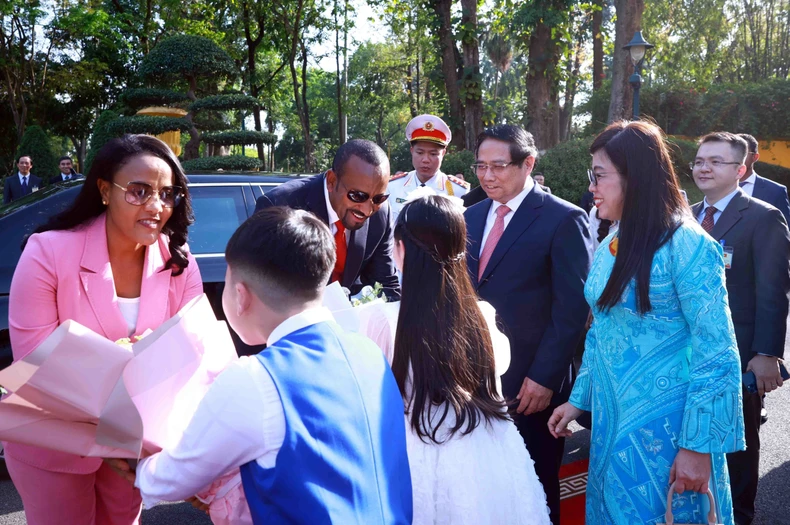 Trong nắng vàng rực rỡ, Thủ tướng Phạm Minh Chính và Phu nhân ra tận cửa xe đón Thủ tướng Abiy Ahmed Ali và Phu nhân. Sau khi đón nhận bó hoa tươi thắm từ các cháu thiếu nhi Hà Nội, Thủ tướng Abiy Ahmed Ali và Thủ tướng Phạm Minh Chính cùng sánh bước trong sự vẫy chào của các em học sinh với Quốc kỳ Việt Nam và Ethiopia trên tay.