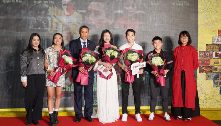 Đại diện đội tuyển nữ cùng đạo diễn Nguyễn Thị Thắm tại buổi ra mắt phim. (Ảnh: VFF)