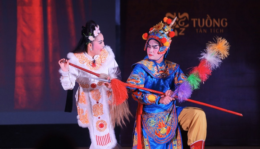 Phần biểu diễn trích đoạn kinh điển “Hồ Nguyệt Cô hóa cáo” và giao lưu với các nghệ sĩ Nhà hát Tuồng Việt Nam mang đến phần mở màn sống động. Ngay sau phần trình diễn, các nghệ sĩ gạo cội như NSƯT Lộc Huyền, NSƯT Trần Long đã có phần giao lưu cùng sinh viên, chia sẻ về hành trình gìn giữ nghệ thuật Tuồng, những câu chuyện hậu trường thú vị, cũng như khích lệ thế hệ trẻ chủ động tiếp cận và lan tỏa giá trị di sản bằng góc nhìn hiện đại.
