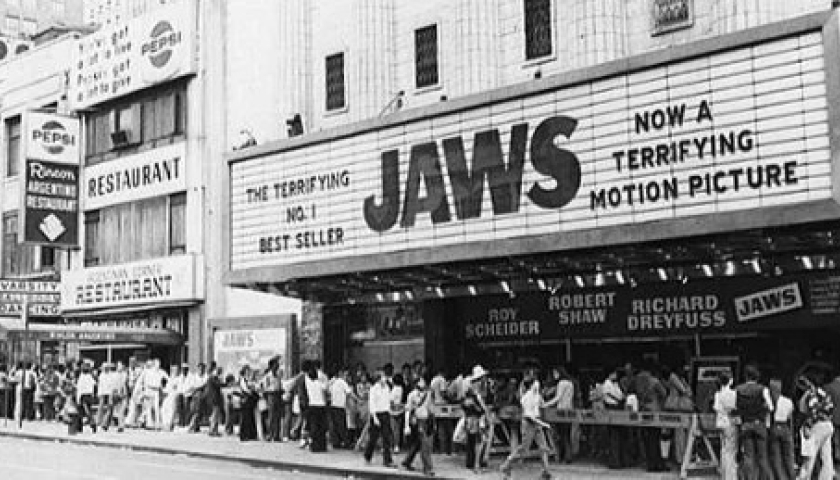 Dựa trên tiểu thuyết của Peter Benchley, Jaws kể về câu chuyện một con cá mập trắng lớn gieo rắc nỗi kinh hoàng cho thị trấn bãi biển Amity Island. Bộ phim nhận được nhiều lời khen ngợi từ các nhà phê bình khi đó và dù kinh phí làm phim vượt xa ngân sách ban đầu thì doanh thu mà Jaws mang lại cũng đi vào lịch sử điện ảnh thế giới, thu về hơn 470 triệu USD. Cùng với Star Wars ra mắt 2 năm sau đó, Jaws mang đến công thức thành công cho bom tấn hè.