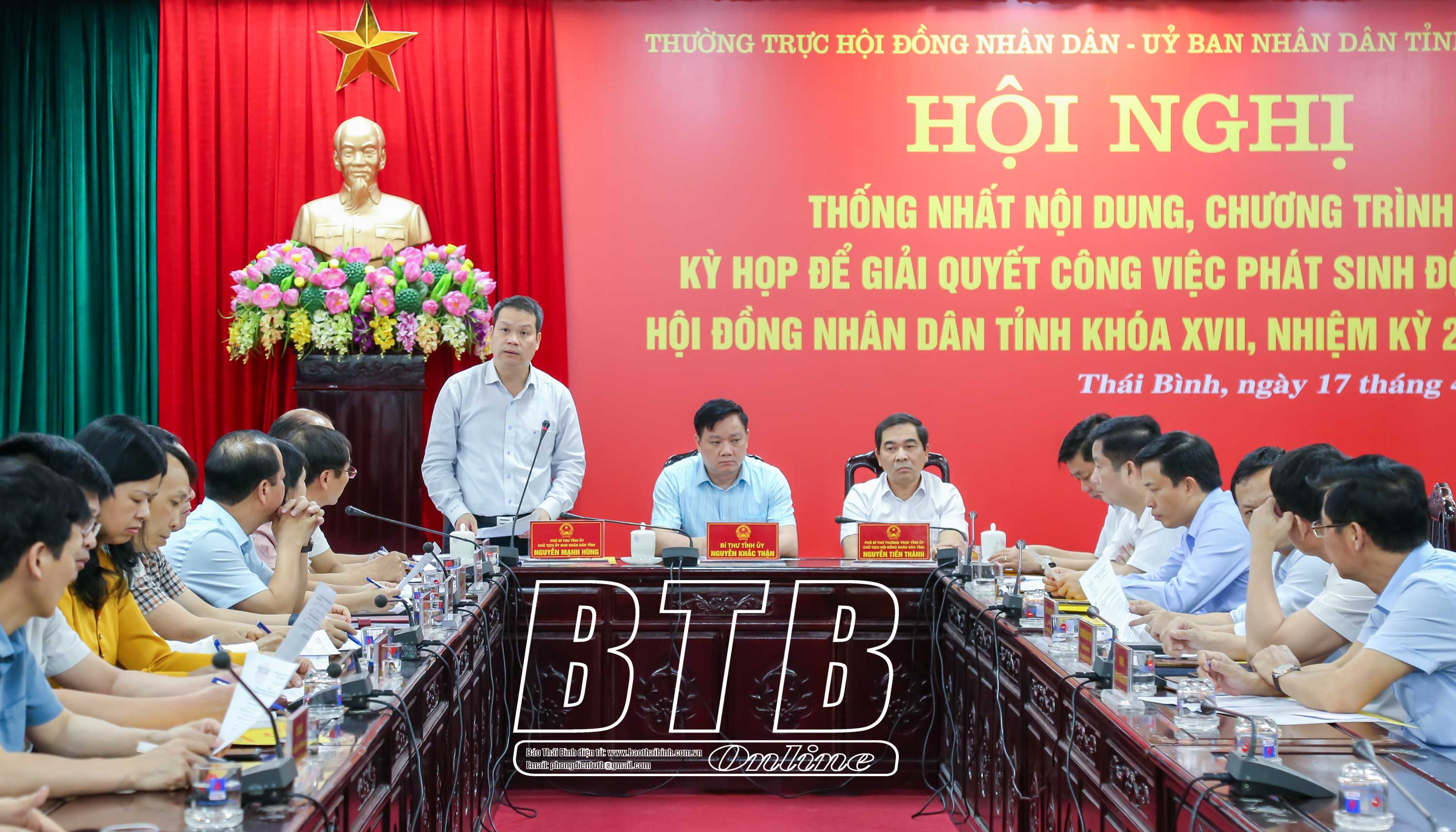 Chiều ngày 17/4, Thường trực HĐND tỉnh phối hợp với UBND tỉnh tổ chức hội nghị thống nhất nội dung, chương trình kỳ họp để giải quyết công việc phát sinh đột xuất HĐND tỉnh khoá XVII, nhiệm kỳ 2021 - 2026. Các đồng chí: Nguyễn Khắc Thận, Bí thư Tỉnh ủy; Nguyễn Tiến Thành, Phó Bí thư thường trực Tỉnh ủy, Chủ tịch HĐND tỉnh; Nguyễn Mạnh Hùng, Phó Bí thư Tỉnh ủy, Chủ tịch UBND tỉnh chủ trì hội nghị. Cùng dự có các đồng chí Ủy viên Ban Thường vụ Tỉnh ủy; lãnh đạo HĐND, UBND tỉnh.