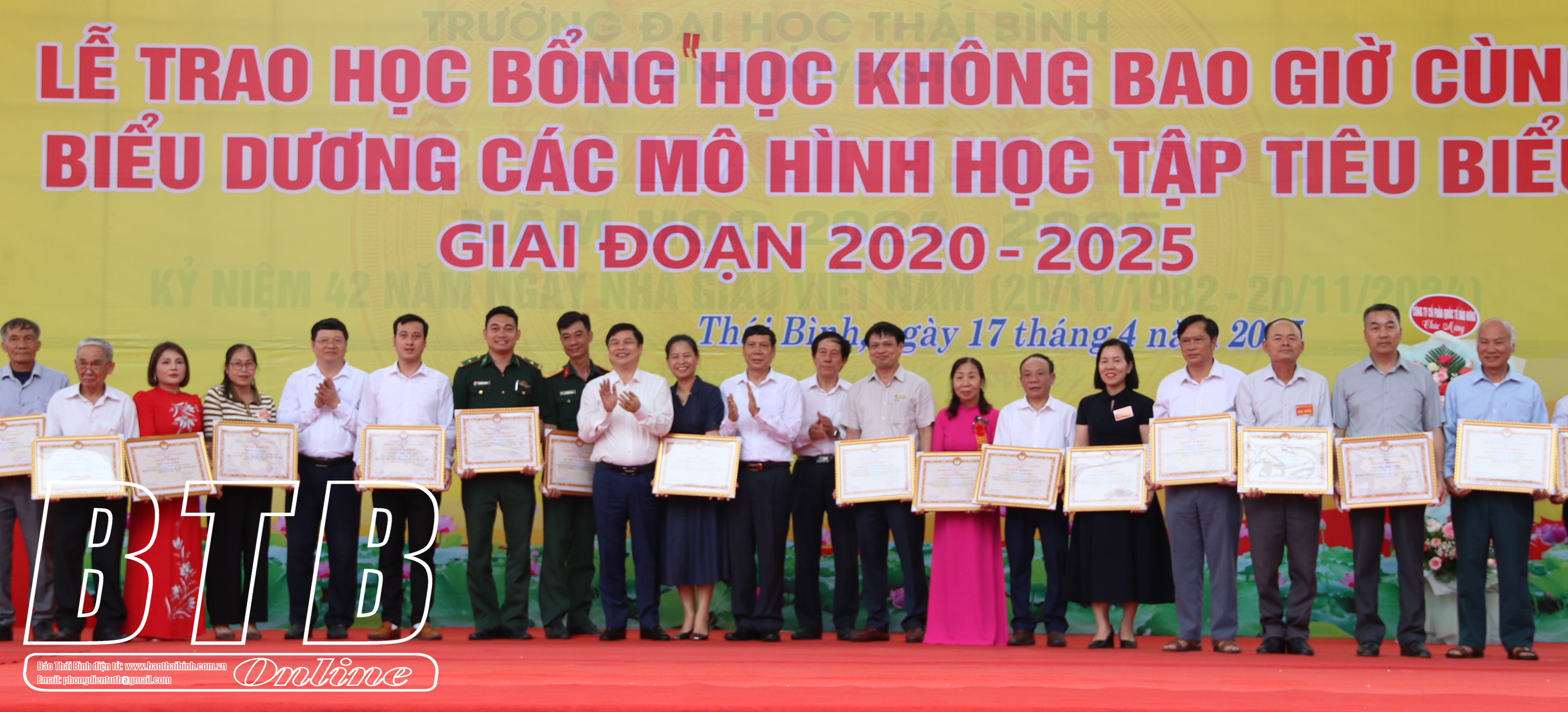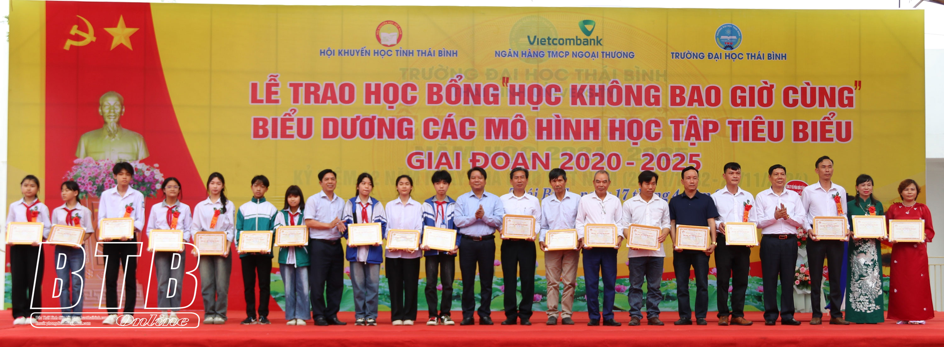 Chiều ngày 17/4, Hội Khuyến học tỉnh phối hợp với Ngân hàng TMCP Ngoại thương Việt Nam (Vietcombank) và Trường Đại học Thái Bình tổ chức lễ trao học bổng “Học không bao giờ cùng”, biểu dương các mô hình học tập tiêu biểu giai đoạn 2020 – 2025. Các đồng chí: Vũ Thanh Vân, Ủy viên Ban Thường vụ Tỉnh ủy, Chủ tịch Ủy ban MTTQ tỉnh; Phạm Văn Nghiêm, Tỉnh ủy viên, Phó Chủ tịch UBND tỉnh, Trưởng ban Chỉ đạo xây dựng xã hội học tập tỉnh tới dự.