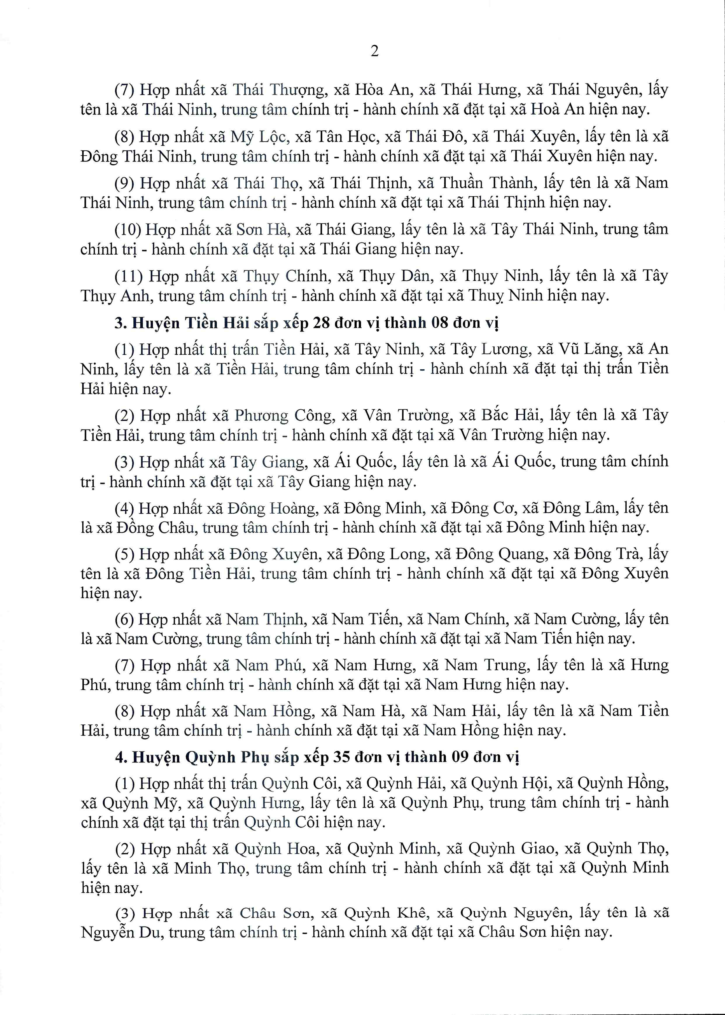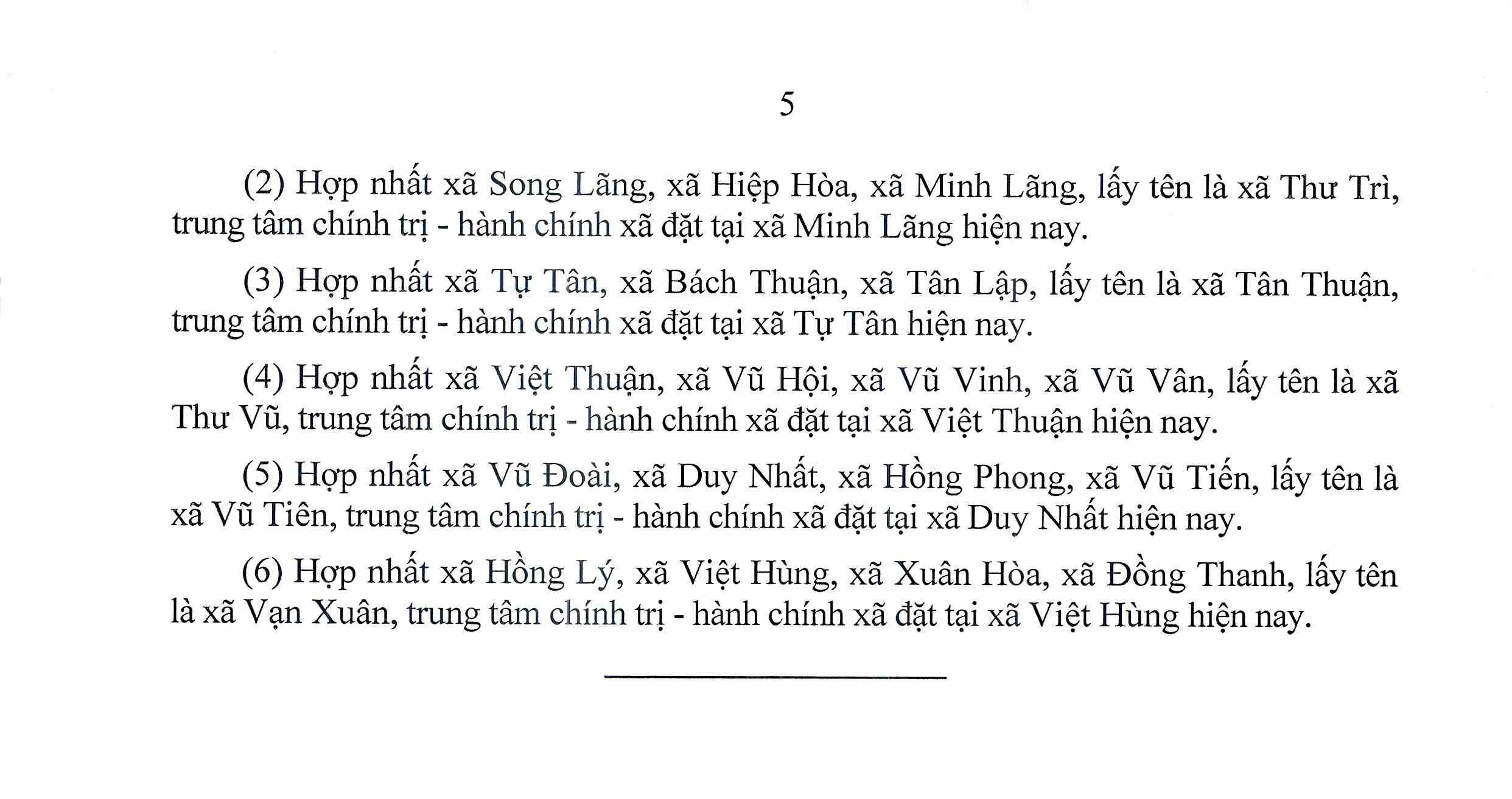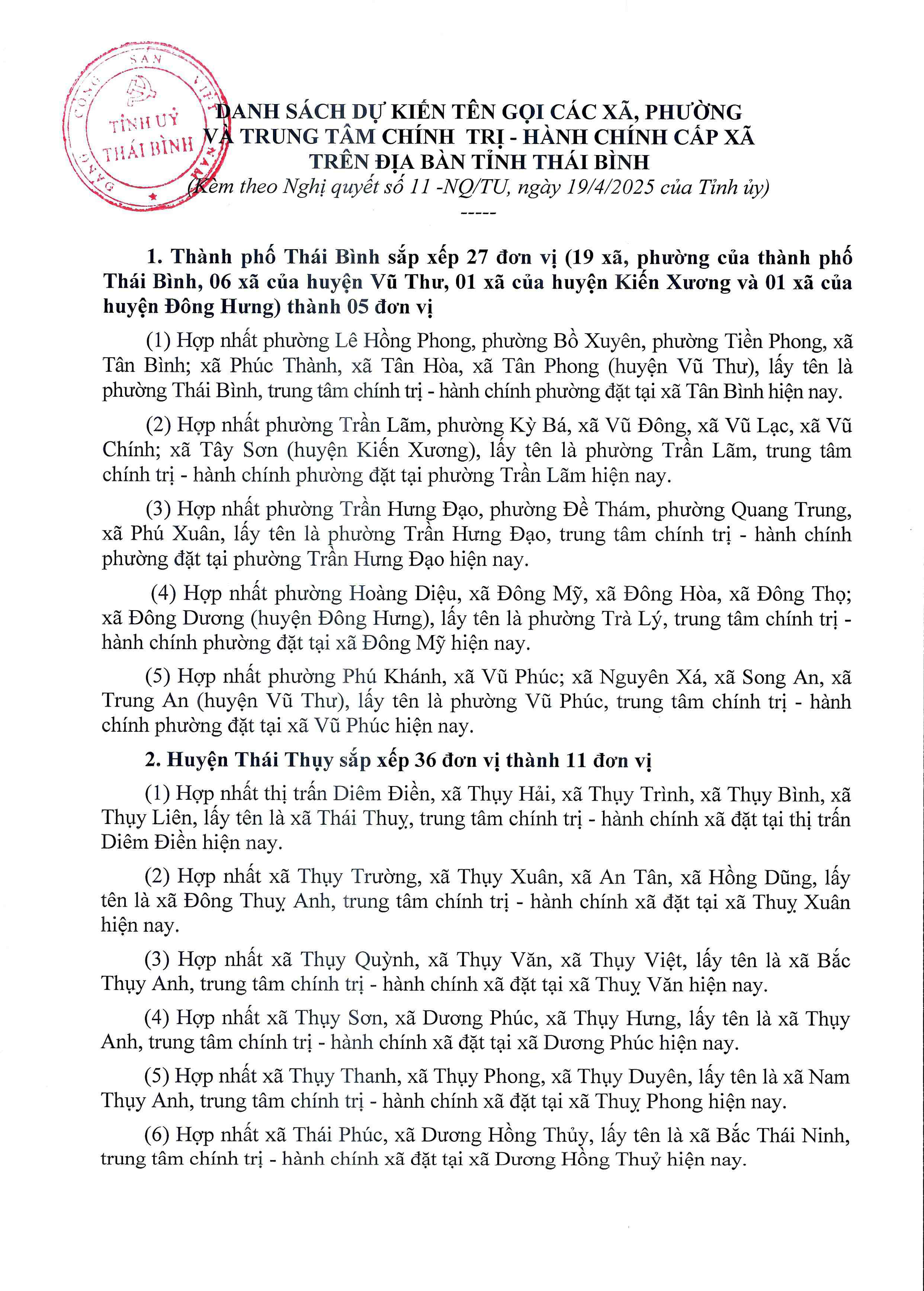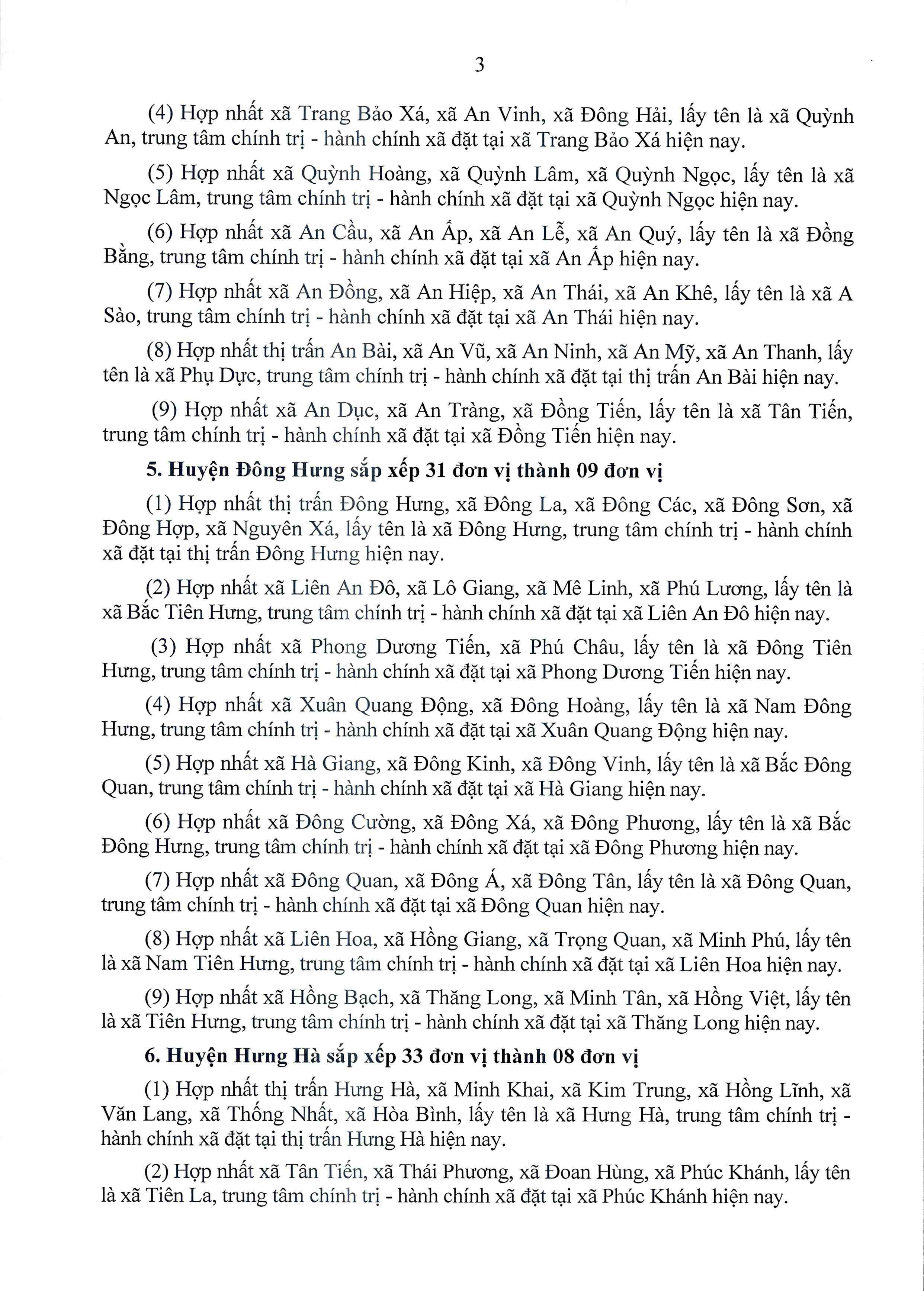 Nghị quyết thống nhất Đề án, phương án hợp nhất tỉnh Hưng Yên và tỉnh Thái Bình, lấy tên là tỉnh Hưng Yên, trung tâm chính trị – hành chính đặt tại tỉnh Hưng Yên hiện nay. Nghị quyết thống nhất Đề án, phương án sắp xếp đơn vị hành chính cấp xã với số lượng là 65 đơn vị hành chính cấp xã sau sắp xếp (60 xã và 5 phường) và tên gọi, trung tâm chính trị – hành chính xã, phường sau sắp xếp.