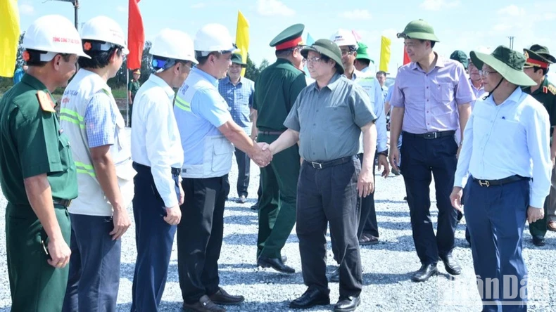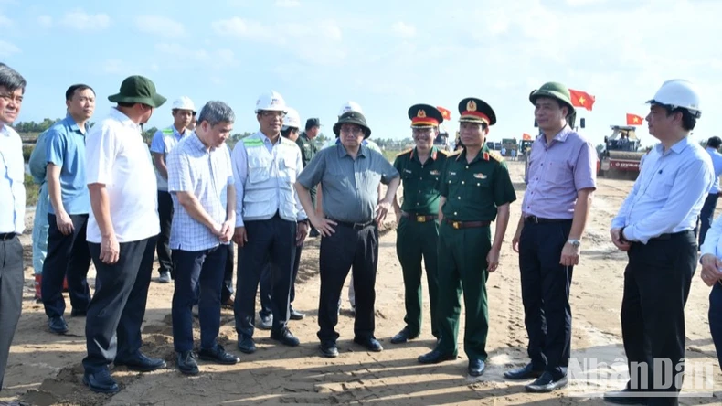 Thủ tướng Phạm Minh Chính thị sát công trường xây dựng Dự án cao tốc Cần Thơ-Cà Mau. (Ảnh: THANH GIANG).
