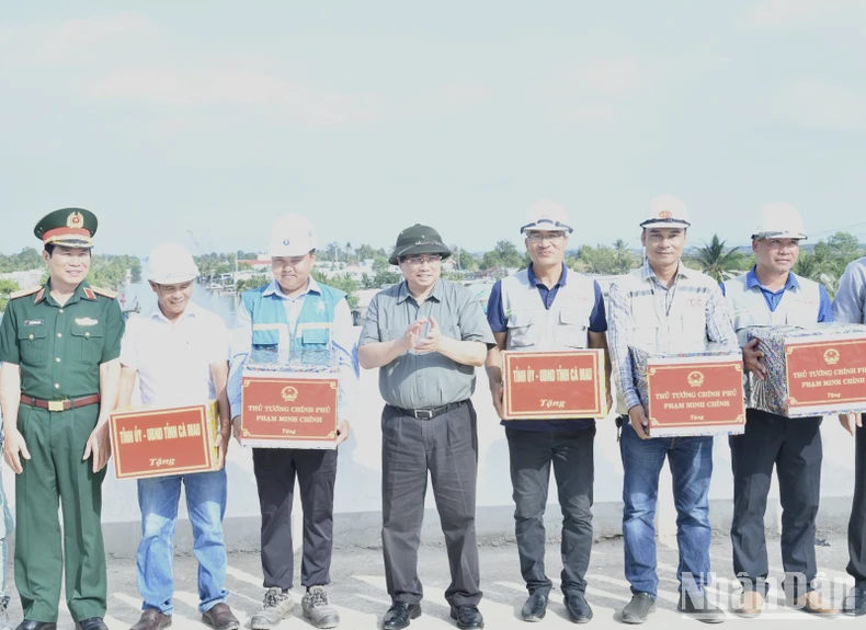 Thủ tướng Phạm Minh Chính tặng quà động viên các đơn vị thi công trên công trường. (Ảnh: THANH GIANG).