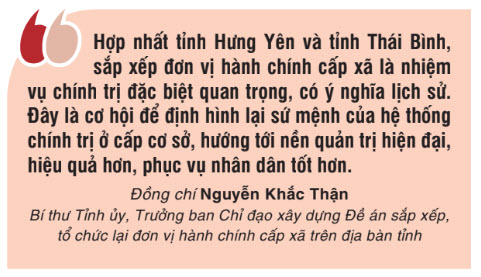 Nghị quyết số 60-NQ/TW Hội nghị lần thứ 11 Ban Chấp hành Trung ương Đảng khóa XIII là sự kế thừa, tiếp nối và hiện thực hóa mục tiêu lớn Nghị quyết số 18- NQ/TW Ban Chấp hành Trung ương Đảng khóa XII “Một số vấn đề về tiếp tục đổi mới, sắp xếp tổ chức bộ máy của hệ thống chính trị tinh gọn, hoạt động hiệu lực, hiệu quả” đã đề ra; đồng thời định hướng rõ ràng cho công cuộc cải cách hệ thống hành chính quốc gia, tạo điều kiện để từng địa phương, trong đó có Thái Bình bứt phá mạnh mẽ, phát triển bền vững, đóng góp tích cực vào sự nghiệp đổi mới đất nước. Việc triển khai thực hiện Nghị quyết số 60-NQ/TW, Nghị quyết số 11-NQ/TU không chỉ mang tính hành chính, kỹ thuật, mà còn là một bước đi chiến lược trong đổi mới toàn diện hệ thống chính trị ở cơ sở. Sau khi hợp nhất, sắp xếp đơn vị hành chính cấp xã, các đơn vị hành chính mới sẽ có quy mô hợp lý hơn, điều kiện phát triển kinh tế - xã hội thuận lợi hơn, tạo đà để nâng cao chất lượng cuộc sống nhân dân, bảo đảm yêu cầu về bảo đảm quốc phòng - an ninh trong tình hình mới. Với tinh thần “nói đi đôi với làm”, tỉnh Thái Bình đang thể hiện rõ quyết tâm cao nhất thực hiện Đề án hợp nhất tỉnh Hưng Yên và tỉnh Thái Bình, Đề án sắp xếp đơn vị hành chính cấp xã. Cùng với sự đồng lòng, thống nhất từ cấp ủy, chính quyền đến nhân dân, tin rằng quá trình hợp nhất, sắp xếp đơn vị hành chính và xây dựng mô hình chính quyền địa phương hai cấp tại Thái Bình sẽ thành công, vì mục tiêu xây dựng hệ thống chính trị tinh gọn, hoạt động hiệu năng, hiệu lực, hiệu quả, phục vụ nhân dân một cách tốt nhất.