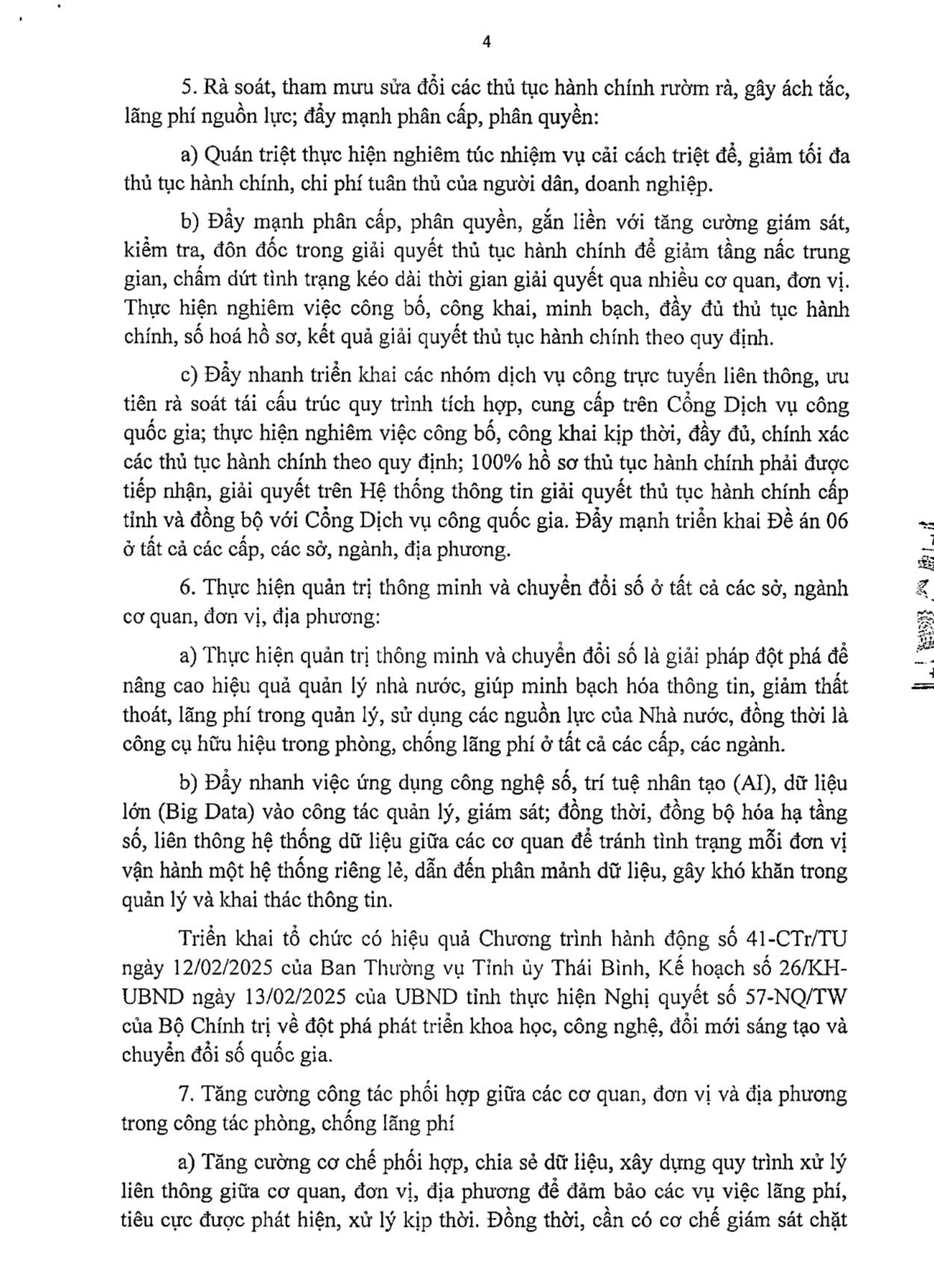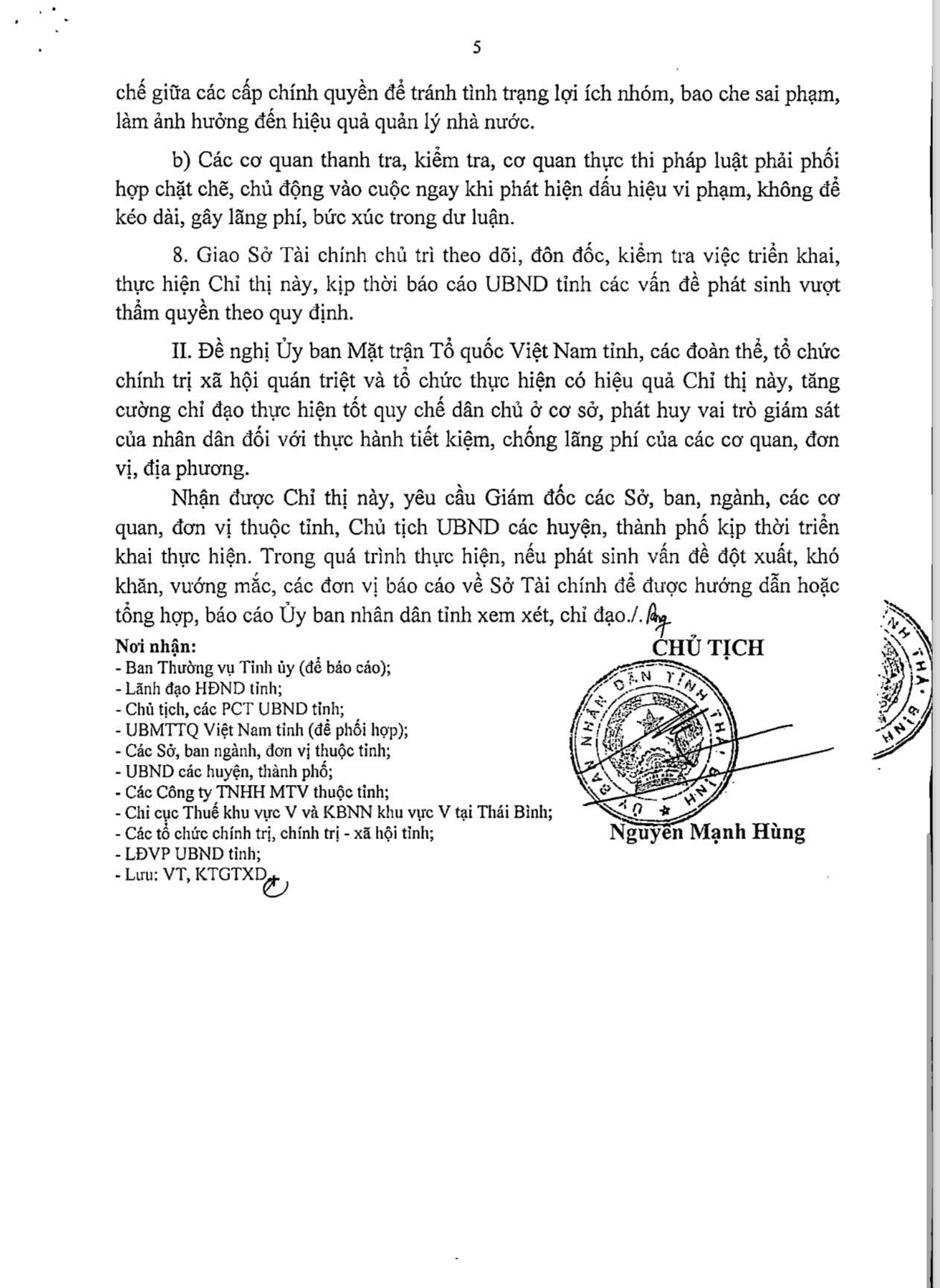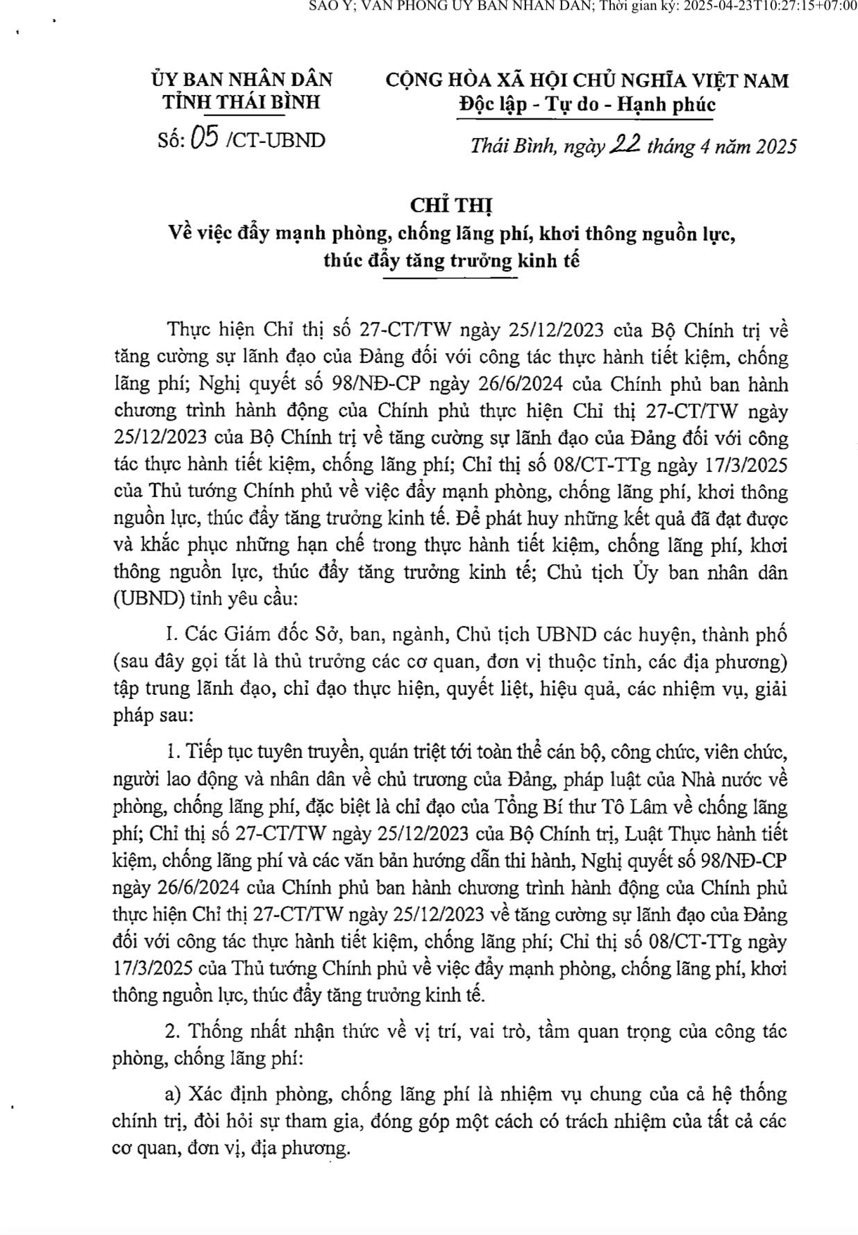 Ngày 22/4, UBND tỉnh Thái Bình có chỉ thị số 05/CT-UBND về việc đẩy mạnh phòng, chống lãng phí, khơi thông nguồn lực, thúc đẩy tăng trưởng kinh tế. Nội dung chỉ thị như sau: