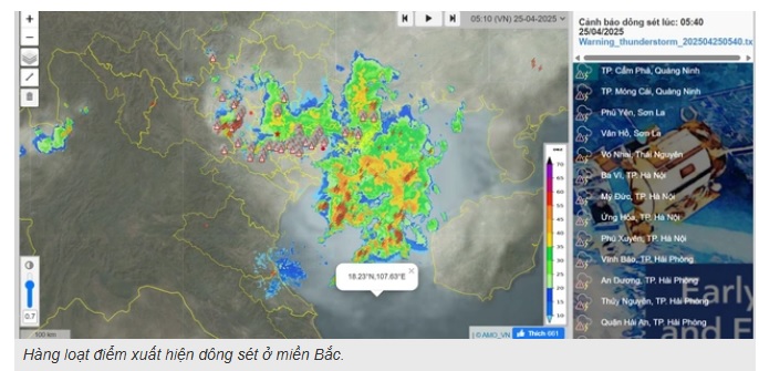Trong khoảng từ 1h30 đến 5h ngày 25/4, ước tính có hơn 23.200 cú sét đánh xuống đất và sét đánh trong mây, trong đó có hơn 10.400 cú sét đánh xuống đất.
