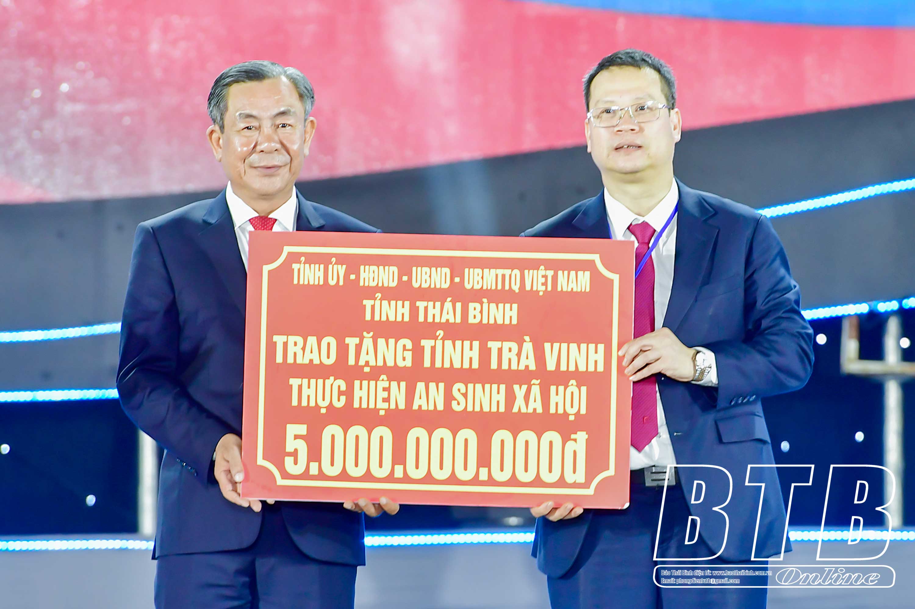 Đồng chí Nguyễn Mạnh Hùng, Phó Bí thư Tỉnh ủy, Chủ tịch UBND tỉnh Thái Bình trao 5 tỷ đồng hỗ trợ an sinh xã hội cho tỉnh Trà Vinh.