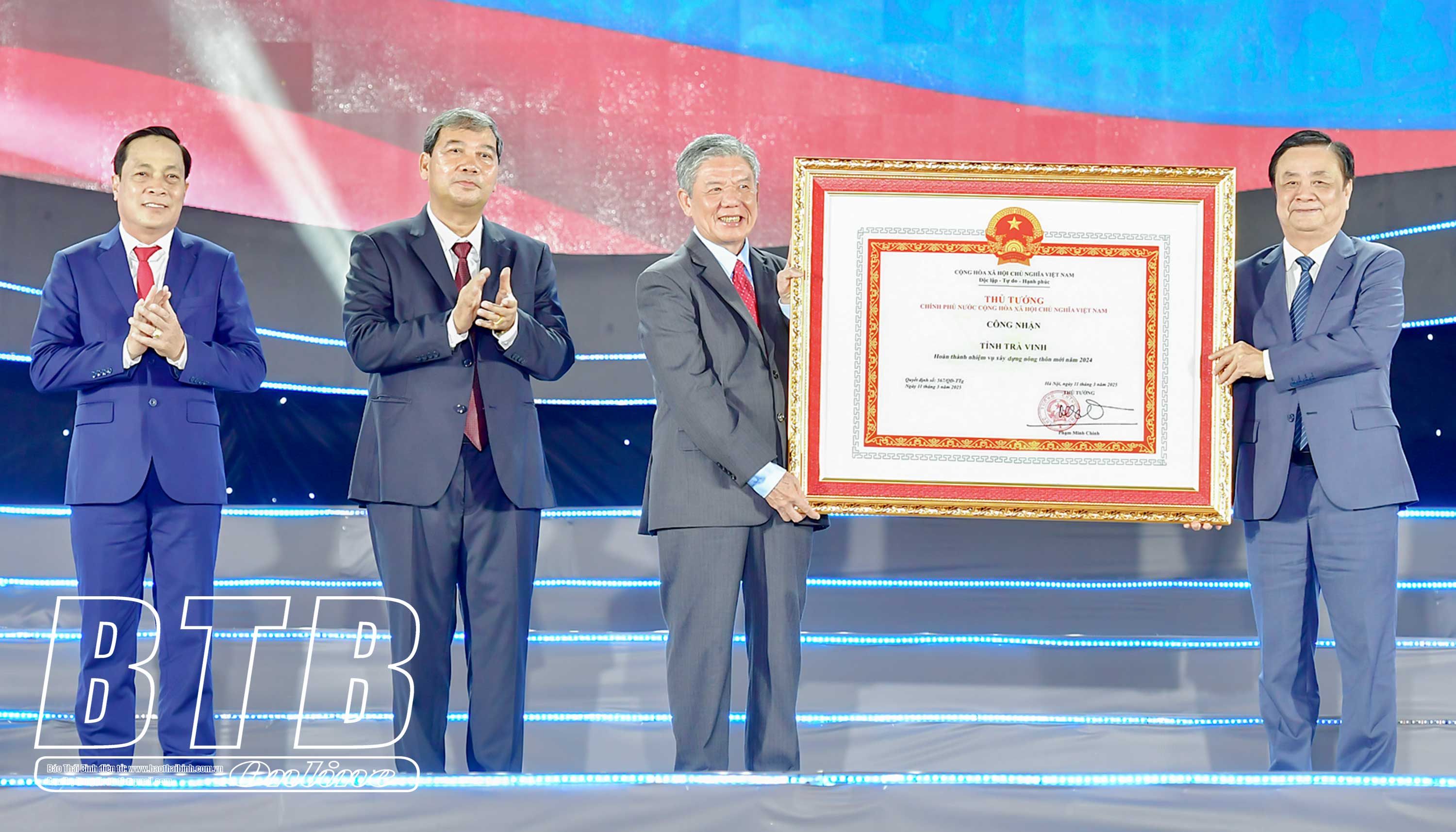 Đồng chí Lê Minh Hoan, Phó Chủ tịch Quốc hội nước Cộng hòa xã hội chủ nghĩa Việt Nam trao bằng công nhận tỉnh Trà Vinh hoàn thành nhiệm vụ xây dựng nông thôn mới.