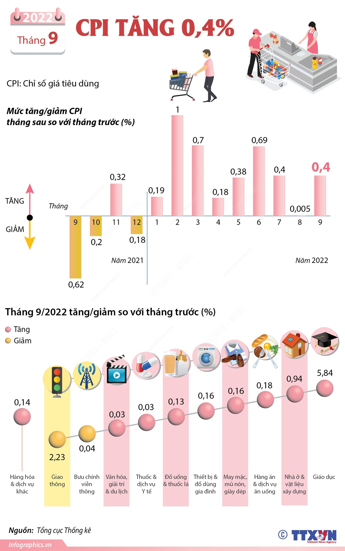 Chỉ số giá tiêu dùng (CPI) tháng 9/2022 tăng 0,4% so với tháng trước. Trong đó, có 9 nhóm hàng hóa và dịch vụ có chỉ số giá tăng và 2 nhóm hàng có chỉ số giá giảm.