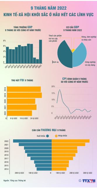 Kinh tế-xã hội 9 tháng năm 2022 của Việt Nam khởi sắc trên hầu hết các lĩnh vực. Hoạt động sản xuất, kinh doanh tăng trưởng mạnh mẽ, đặc biệt so với cùng kỳ năm trước (khi nhiều địa phương trên cả nước phải thực hiện giãn cách xã hội kéo dài để phòng chống dịch bệnh, nhất là tại các tỉnh kinh tế trọng điểm phía Nam). Nhiều ngành đã khôi phục mạnh mẽ và đạt mức tăng trưởng cao hơn so với thời điểm trước khi dịch COVID-19 xảy ra như: Công nghiệp chế biến, chế tạo tổng mức bán lẻ hàng hóa và doanh thu dịch vụ tiêu dùng xuất khẩu hàng hóa…