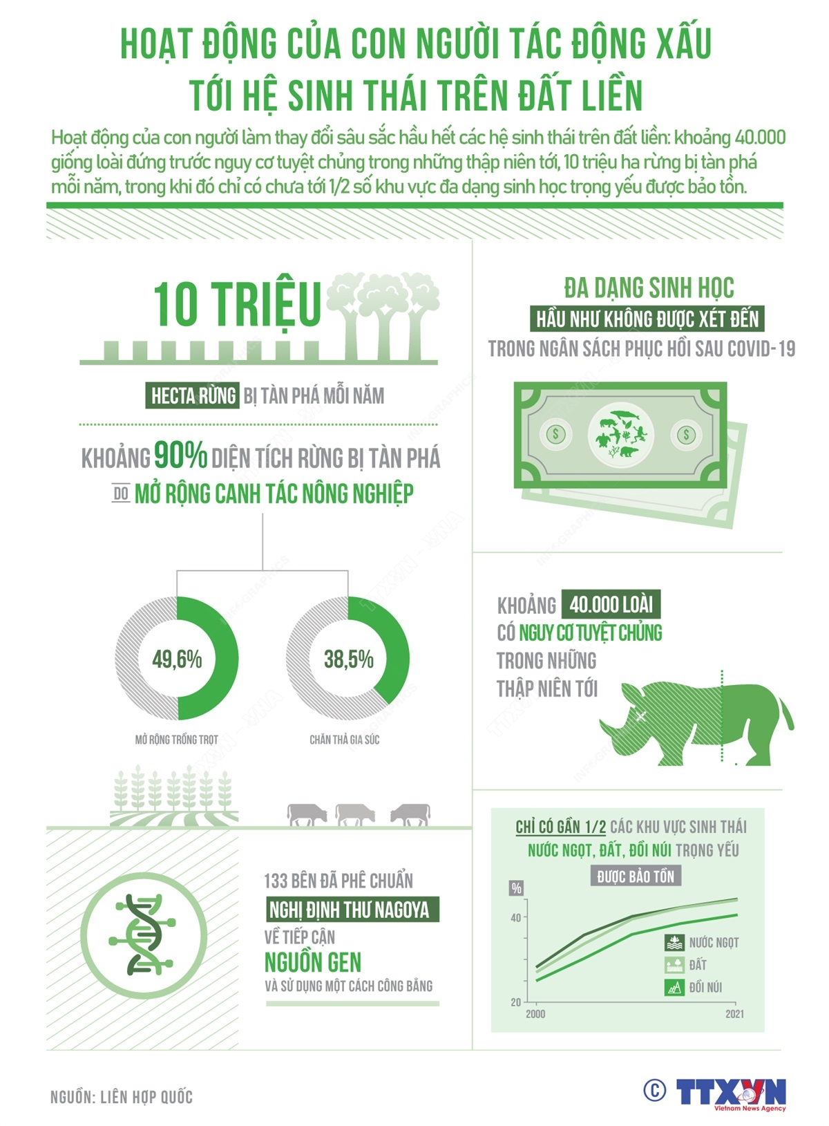 Hoạt động của con người làm thay đổi sâu sắc hầu hết các hệ sinh thái trên đất liền: khoảng 40.000 giống loài đứng trước nguy cơ tuyệt chủng trong những thập niên tới, 10 triệu ha rừng bị tàn phá mỗi năm, trong khi đó chỉ có chưa tới 1/2 số khu vực đa dạng sinh học trọng yếu được bảo tồn.