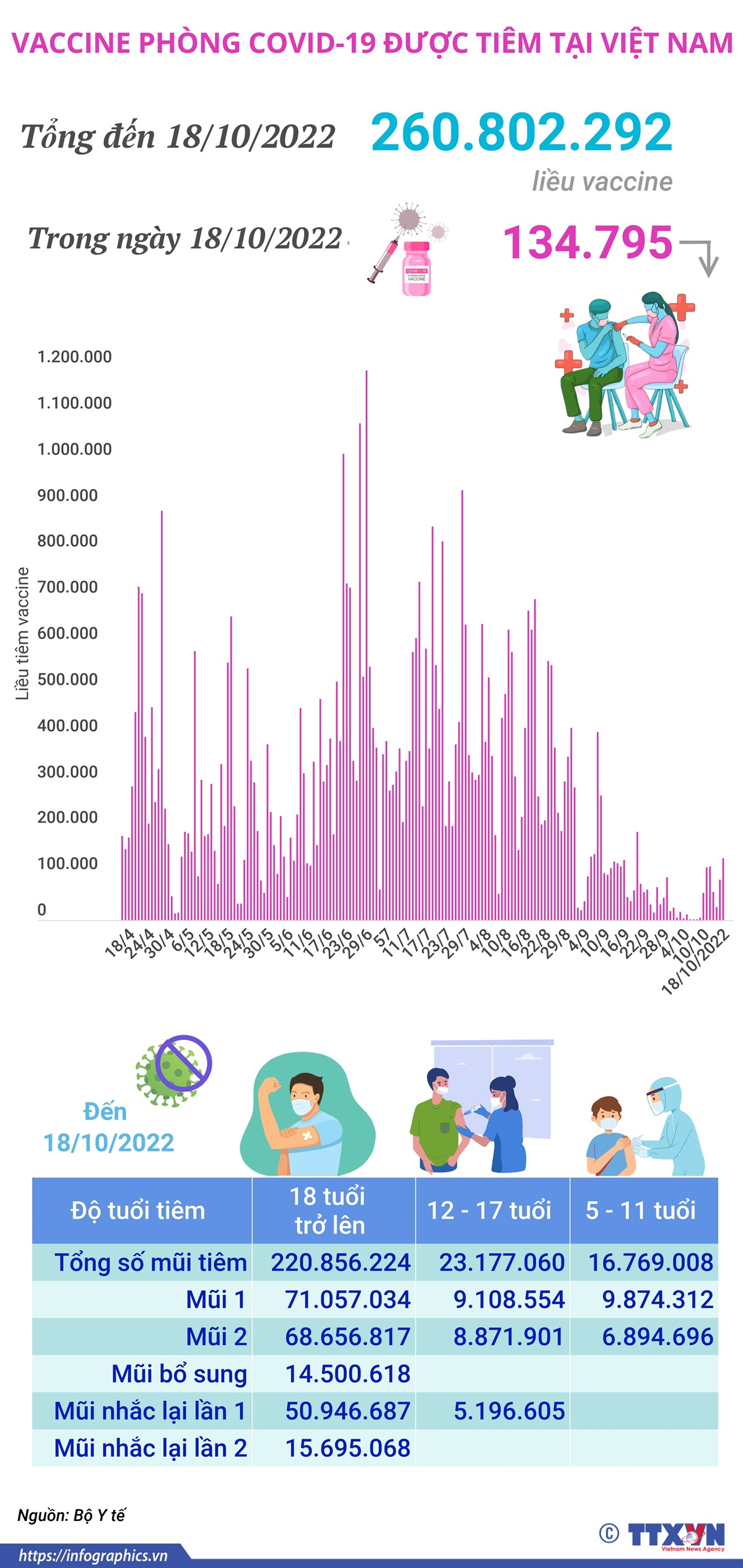 Trong ngày 18/10/2022 có 134.795 liều vaccine phòng COVID-19 được tiêm. Như vậy, tổng số liều vaccine đã được tiêm tại Việt Nam là 260.802.292 liều trong đó tiêm cho trẻ từ 5-11 tuổi là 16.769.008 liều, tiêm cho trẻ từ 12-17 tuổi là 23.177.060 liều và tiêm cho người từ 18 tuổi trở lên là 220.856.224 liều.