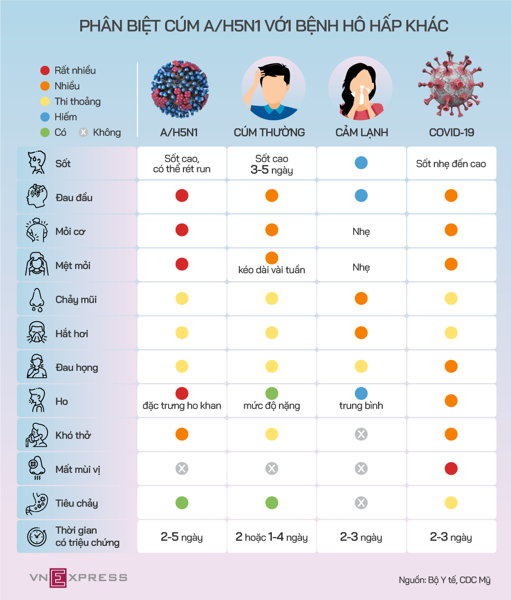 Triệu chứng đặc trưng của cúm A/H5N1 là ho khan kèm sốt cao có thể rét run, còn cúm thường sốt nhẹ hơn nhưng mệt mỏi kéo dài đến vài tuần.