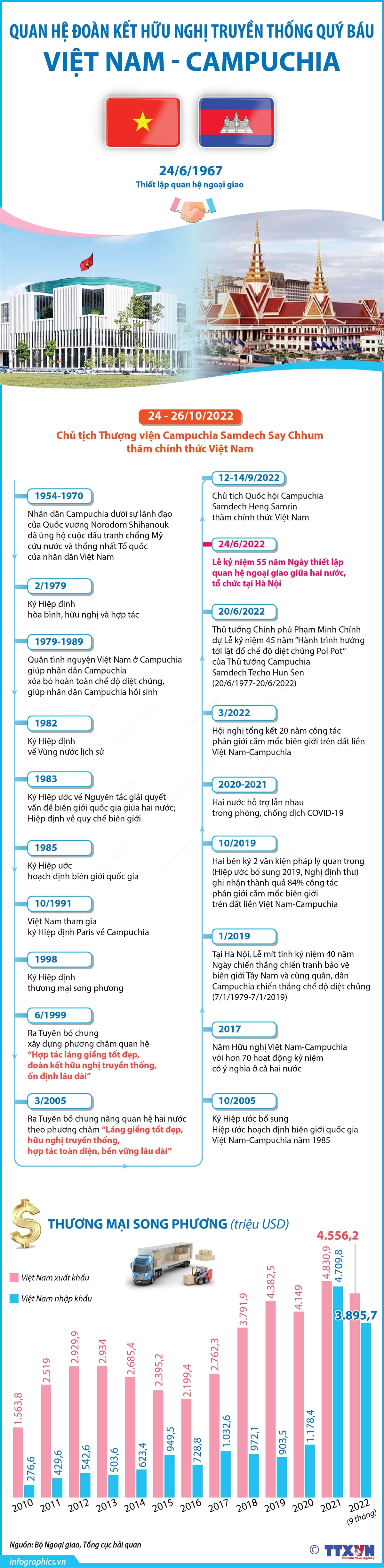 Nhận lời mời của Chủ tịch Quốc hội nước CHXHCN Việt Nam Vương Đình Huệ, Chủ tịch Thượng viện Vương quốc Campuchia Samdech Say Chhum dẫn đầu Đoàn Đại biểu cấp cao Thượng viện Vương quốc Campuchia thăm chính thức Việt Nam từ ngày 24 đến 26/10/2022.