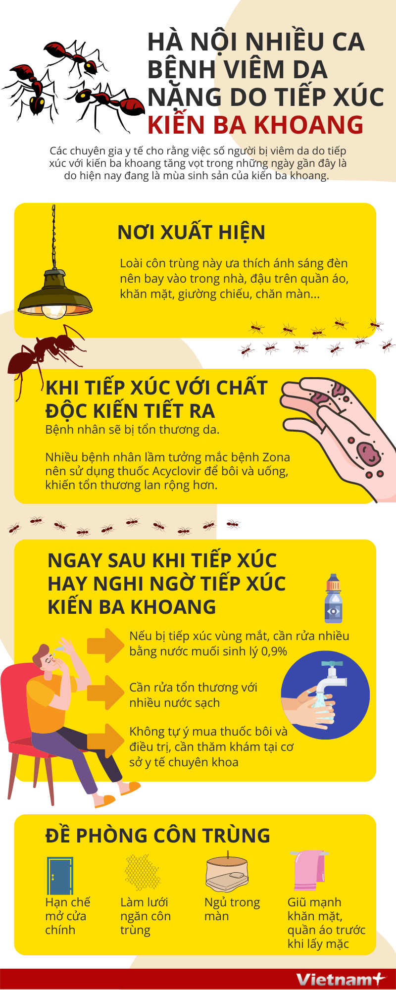 Bệnh viện Da liễu Trung ương, Da liễu Hà Nội và các bệnh viện đóng trên địa bàn Hà Nội tiếp nhận nhiều người dân bị viêm da nặng do tiếp xúc với kiến ba khoang. Số bệnh nhân lên đến hàng nghìn người.