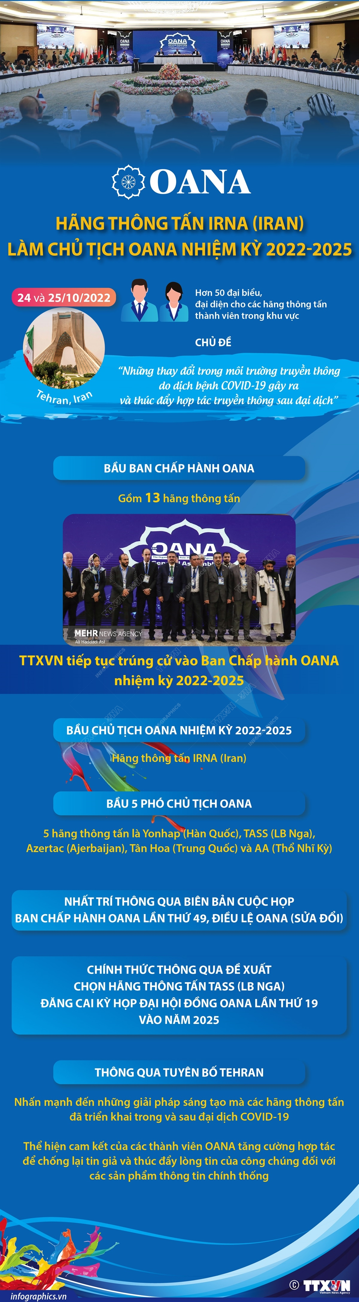 Tại thủ đô Tehran của Iran, Đại hội đồng lần thứ 18 của Tổ chức các hãng thông tấn châu Á - Thái Bình Dương (OANA) đã bế mạc, bầu hãng thông tấn IRNA (Iran) làm Chủ tịch OANA nhiệm kỳ 2022 - 2025 và thông qua Tuyên bố Tehran.