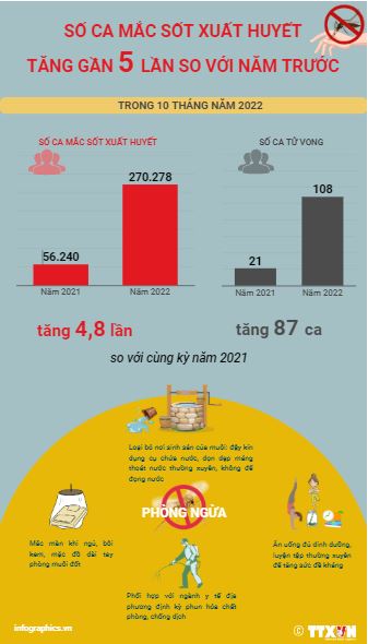 Tích lũy từ đầu năm đến nay cả nước ghi nhận 270.278 trường hợp mắc sốt xuất huyết, 108 ca tử vong. So với cùng kỳ năm 2021 (56.240/21) số mắc tăng 4,8 lần, số tử vong tăng 87 trường hợp. Số mắc và tử vong do sốt xuất huyết tiếp tục diễn biến phức tạp và số mắc ở mức cao tại nhiều địa phương. Các chuyên gia lo ngại, trong tháng 11 và 12 tới có thể sẽ là đỉnh dịch của sốt xuất huyết năm nay. Người dân cần chủ động các biện pháp phòng, chống dịch như diệt bọ gậy, lăng quăng, ngủ mắc màn… không để muỗi đốt.