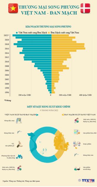 Quan hệ thương mại giữa Việt Nam và Đan Mạch chứng kiến sự phát triển mạnh mẽ, với tổng kim ngạch thương mại song phương tăng 6,8 lần trong giai đoạn 2000-2021. Riêng trong 9 tháng năm 2022, tổng kim ngạch xuất nhập khẩu giữa hai nước đạt trên 554 triệu USD, bằng 94% cả năm 2021.