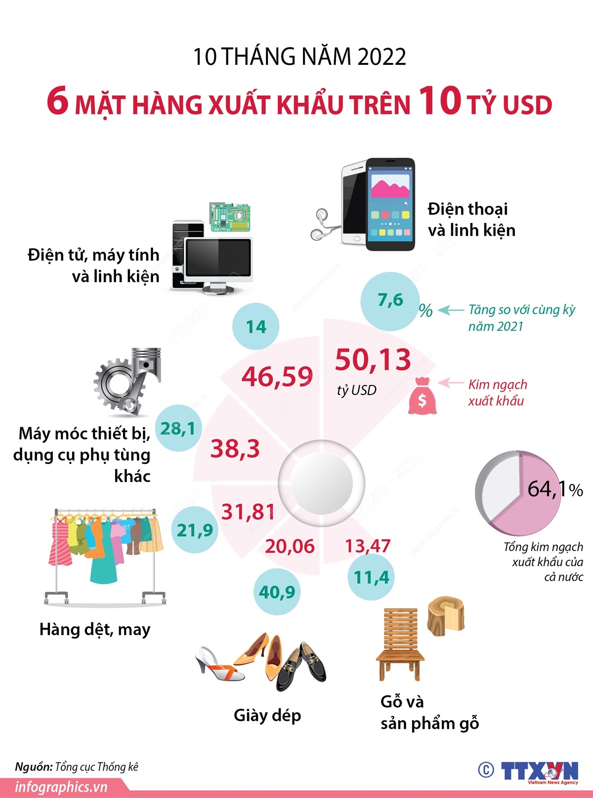 10 tháng năm 2022, có 6 mặt hàng xuất khẩu trên 10 tỷ USD, chiếm 64,1% tổng kim ngạch xuất khẩu. Đó là các mặt hàng: Điện tử, máy tính và linh kiện; điện thoại và linh kiện; hàng dệt may; giày dép...