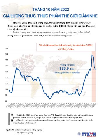 Tháng 10/2022, chỉ số giá lương thực, thực phẩm trung bình thế giới ở mức 135,9 điểm, đánh dấu tháng giảm thứ 7 liên tiếp và giảm khoảng 14,9% so với mức cao kỷ lục hồi tháng 3/2022.