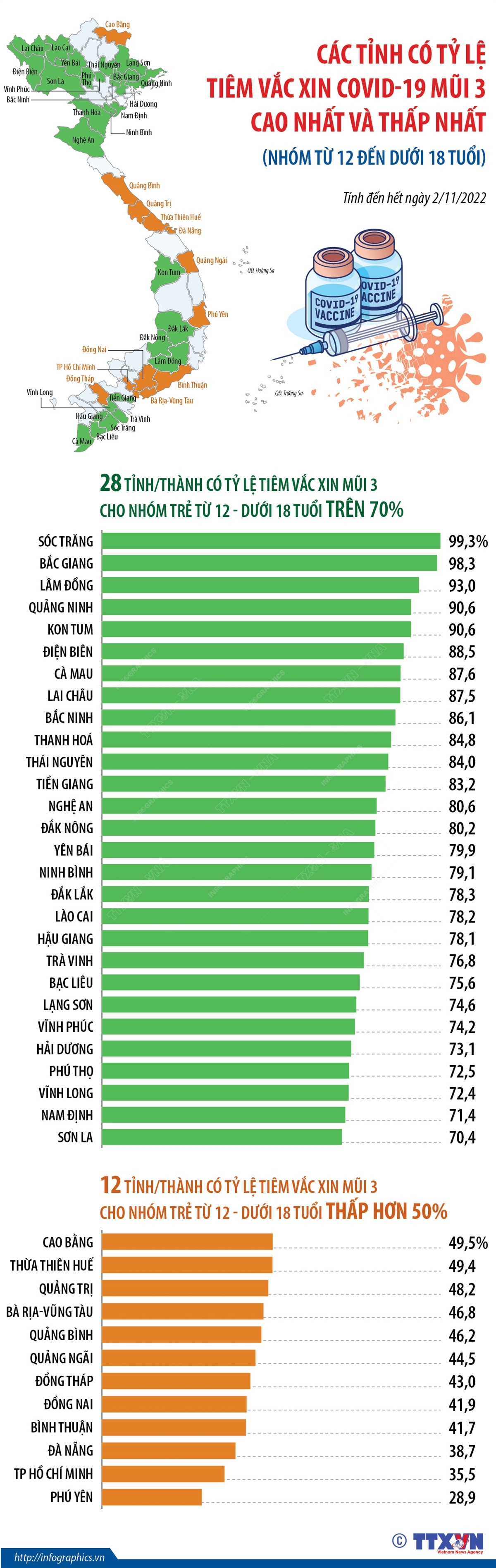 Tính đến hết ngày 2/11/2022, Việt Nam đã tiêm được 5.463.292 liều vắc xin phòng COVID-19 mũi 3 cho nhóm trẻ từ 12 - dưới 18 tuổi, tỷ lệ đạt 63,8%. Trong đó, có 28/63 tỉnh, thành phố có tỷ lệ tiêm đạt trên 70%; 23/63 tỉnh, thành phố có tỷ lệ tiêm từ 50% đến dưới 70%; 12/63 tỉnh, thành phố có tỷ lệ tiêm đạt dưới 50%. Có 5 tỉnh có tỷ lệ tiêm cao nhất là: Sóc Trăng, Bắc Giang, Lâm Đồng, Quảng Ninh, Kon Tum.