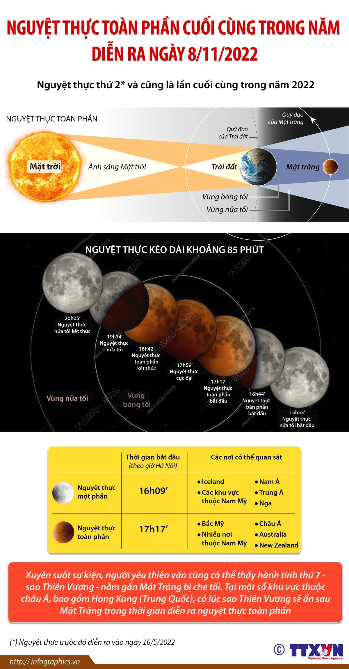 Ngày 8/11/2022, hiện tượng thiên văn kỳ thú nguyệt thực một phần bắt đầu lúc 16h09 (theo giờ Hà Nội), sự kiện toàn phần diễn ra lúc 17h17 và kéo dài khoảng 85 phút. Đây là nguyệt thực lần thứ 2 và cũng là lần cuối cùng trong năm 2022.