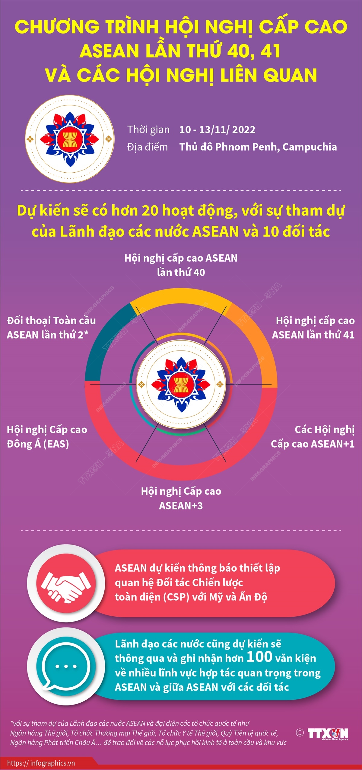 Hội nghị Cấp cao ASEAN lần thứ 40, 41 và các Hội nghị Cấp cao liên quan sẽ diễn ra tại Phnom Penh, Campuchia, từ ngày 10-13/11/2022. Các Hội nghị Cấp cao lần này đánh dấu sự nối lại các trao đổi, đối thoại trực tiếp giữa các Lãnh đạo sau hơn hai năm bị gián đoạn do dịch bệnh COVID-19. Đây sẽ là dịp để Lãnh đạo các nước trao đổi về các nỗ lực xây dựng Cộng đồng ASEAN, tăng cường đoàn kết và vai trò trung tâm của ASEAN, kiểm điểm và định hướng quan hệ giữa ASEAN với các đối tác, và thảo luận về nhiều vấn đề chiến lược ở khu vực và thế giới.